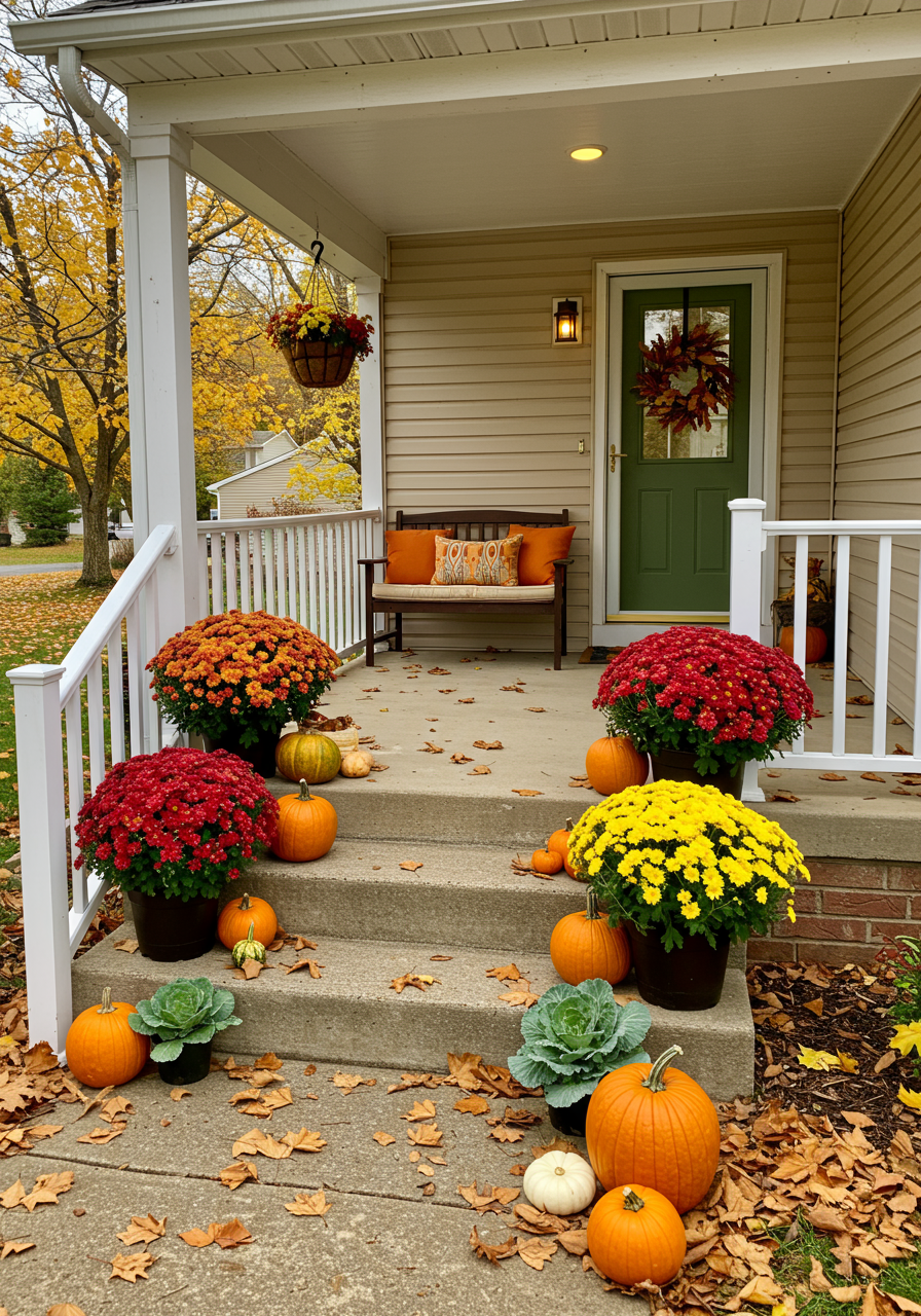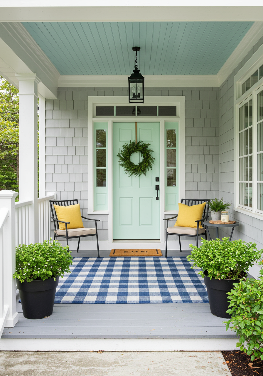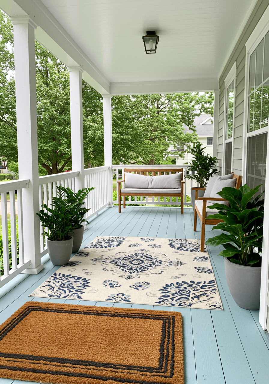 One easy way to choose a color scheme for your porch is by using the color of your front door or trim as a jumping-off point. Repeat the same hue or hues in each of the accents you choose, such as outdoor cushions and pillows, a doormat or an outdoor rug, and flower pots.