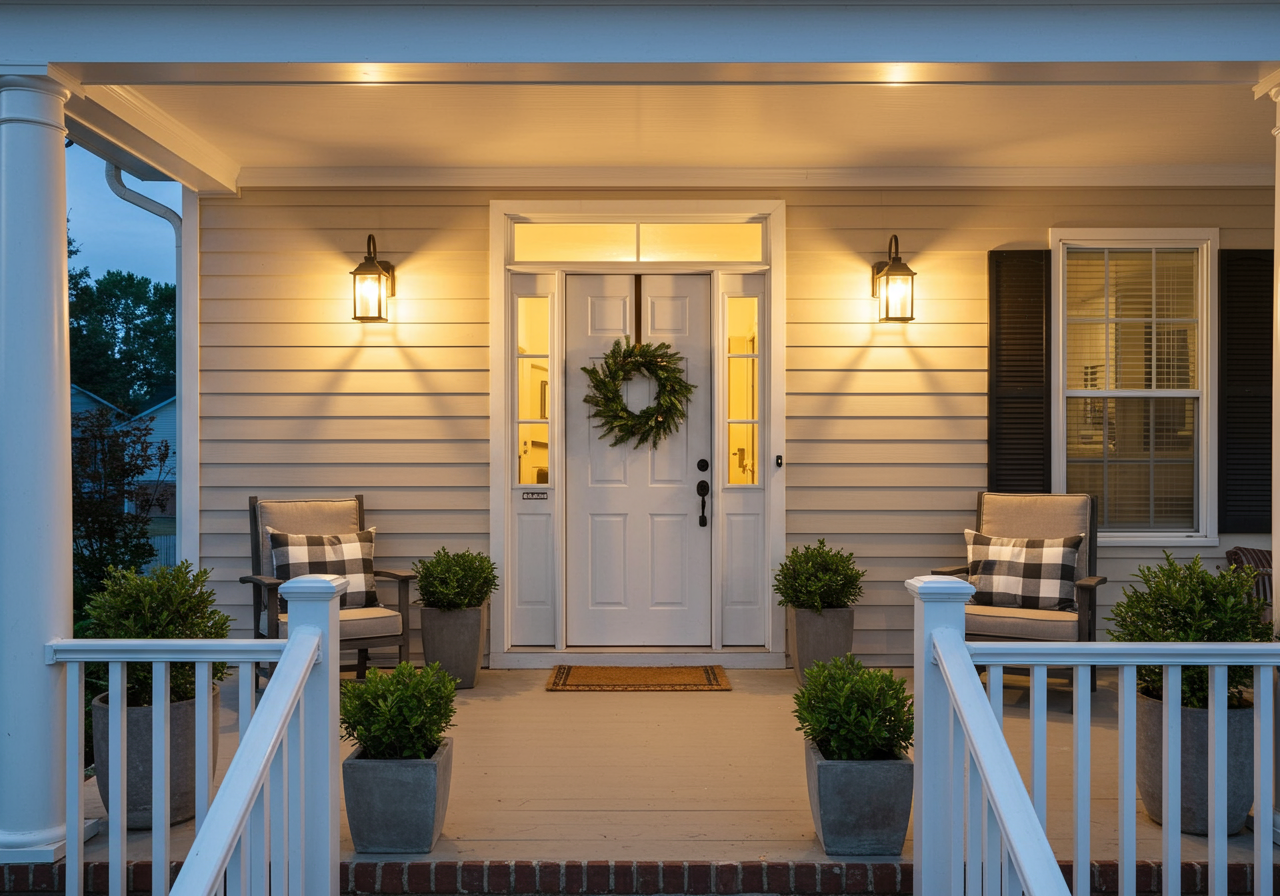 A well-lit porch helps visitors and package deliverers find your place, but also (perhaps more important) creates a warm, welcoming mood that says “home sweet home.” Aim for at least three sources of light to create a warm glow — a pair of sconces near the seating area plus a light above the door should do the trick. Even better: Add a fourth light near the house numbers (as seen here) to make it easier for visitors to find your address at night.
