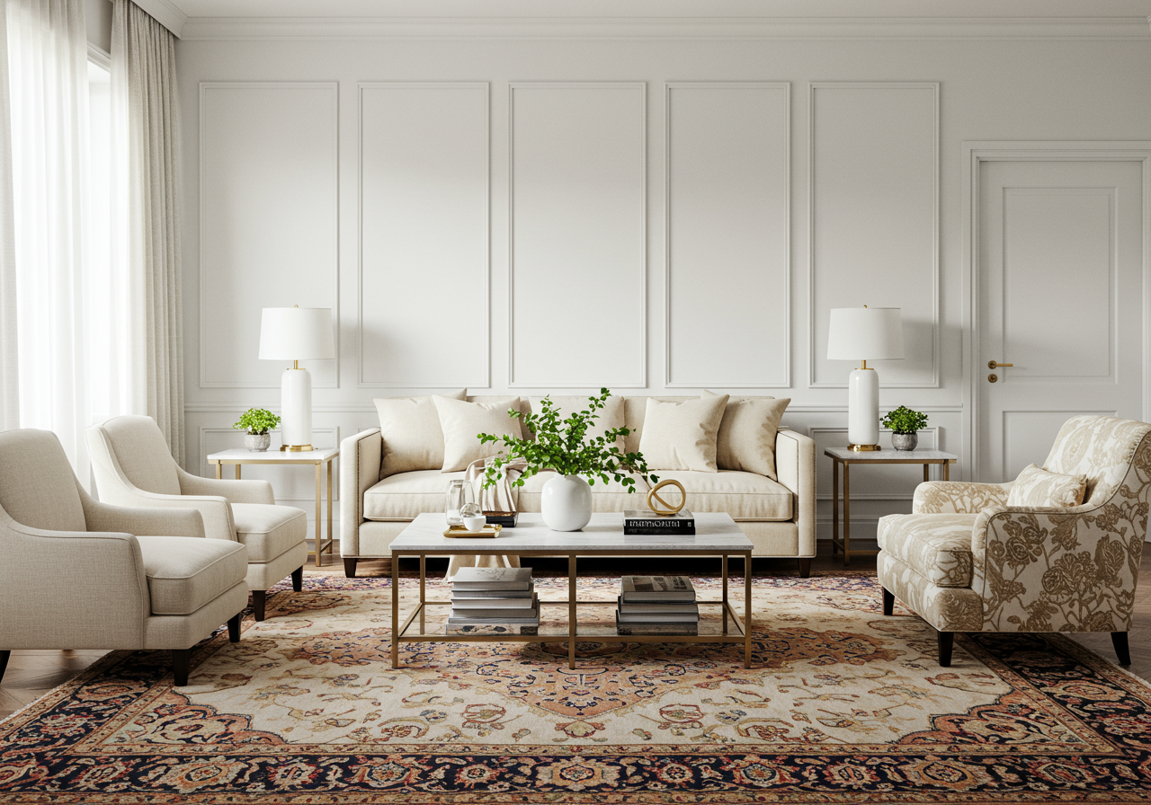 For example, the designer of this room used a natural-fiber rug to add more warmth to the white-and-gray seating area, layered with a smaller patterned rug for a hit of color. Alternatively, lay a high-texture accent rug on top of a patterned area rug.
