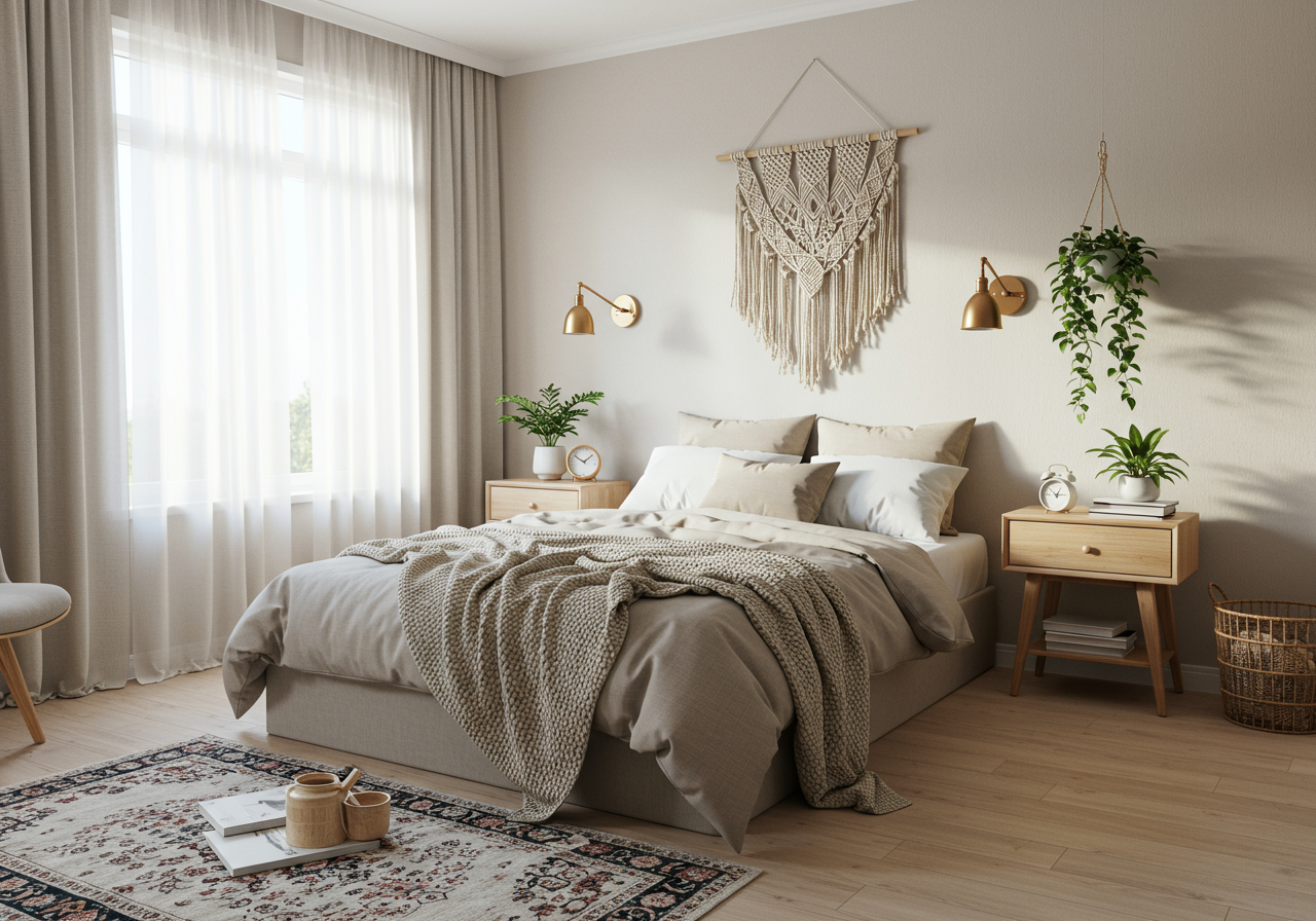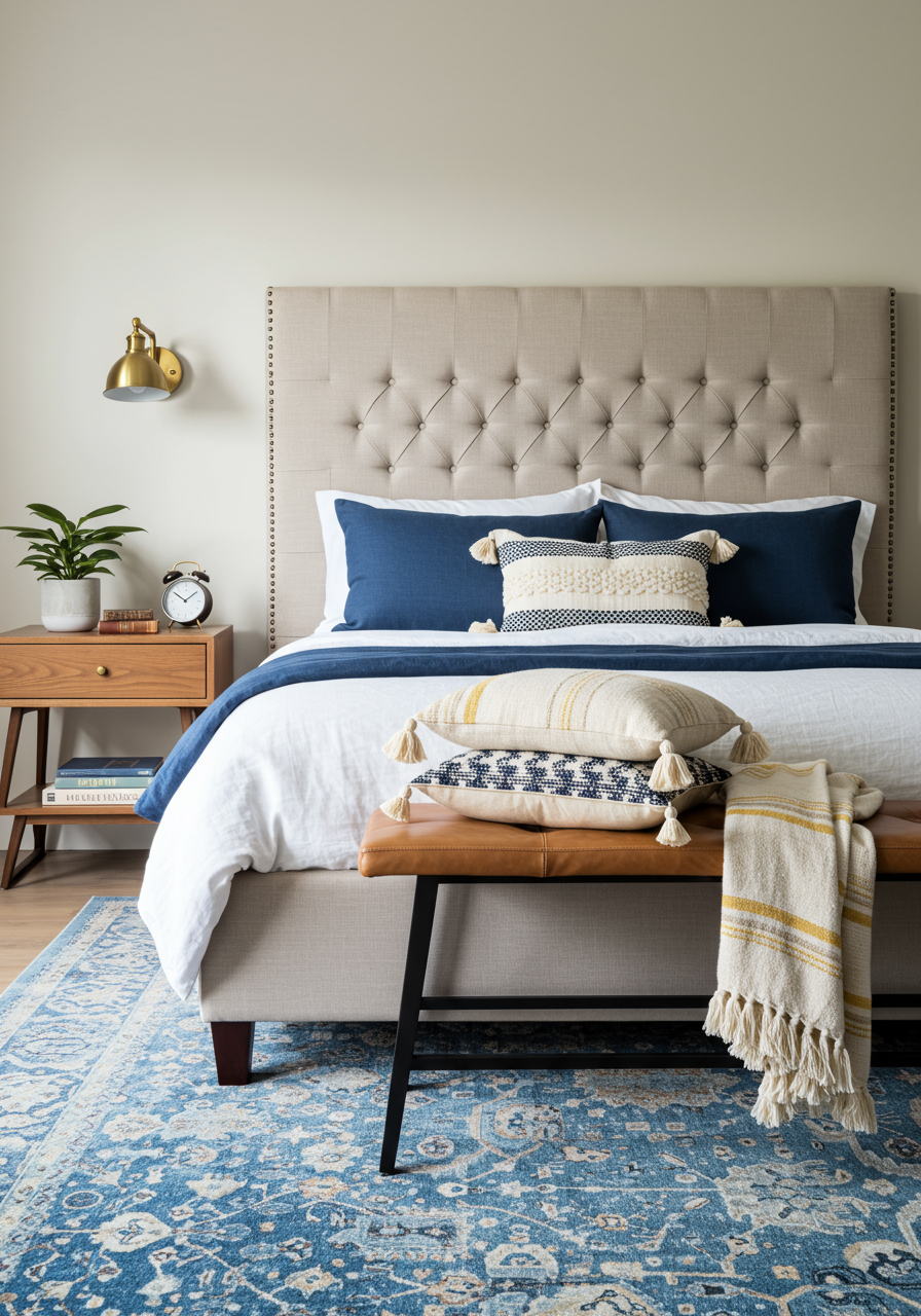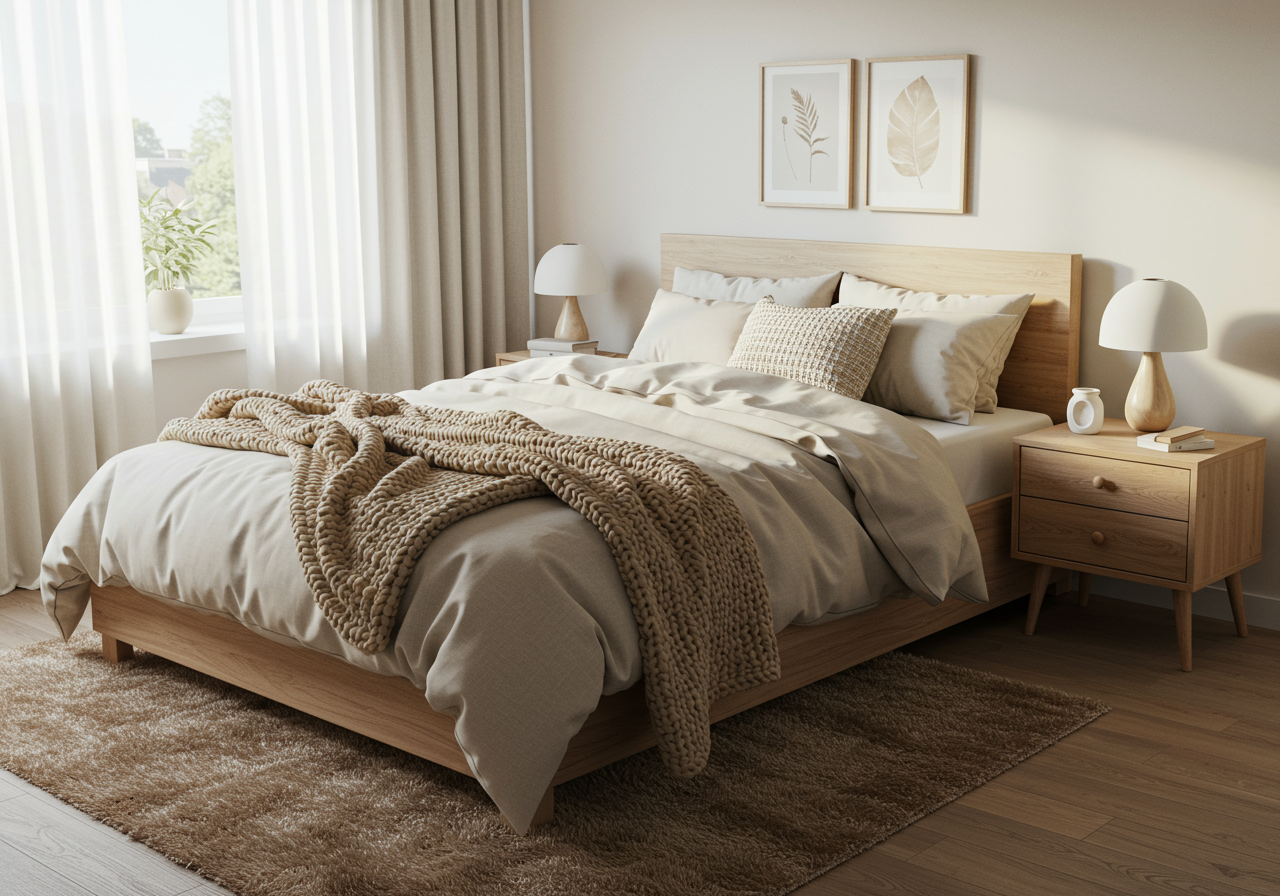 Add interest to neutral bedrooms with piles of quilted coverlets, pillows and knit throws. The more variety of textures, the better. The layered-texture effect not only makes it easy to pull up blankets for extra warmth, but it also makes the bed feel all the more cozy and inviting. For even more softness, add gauzy curtains and a plush bedside rug or carpeting.