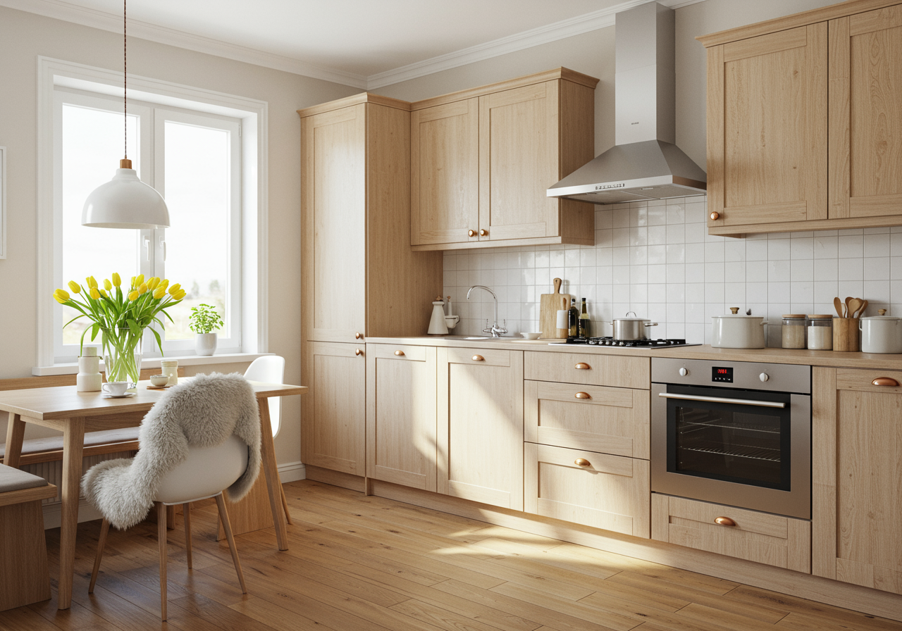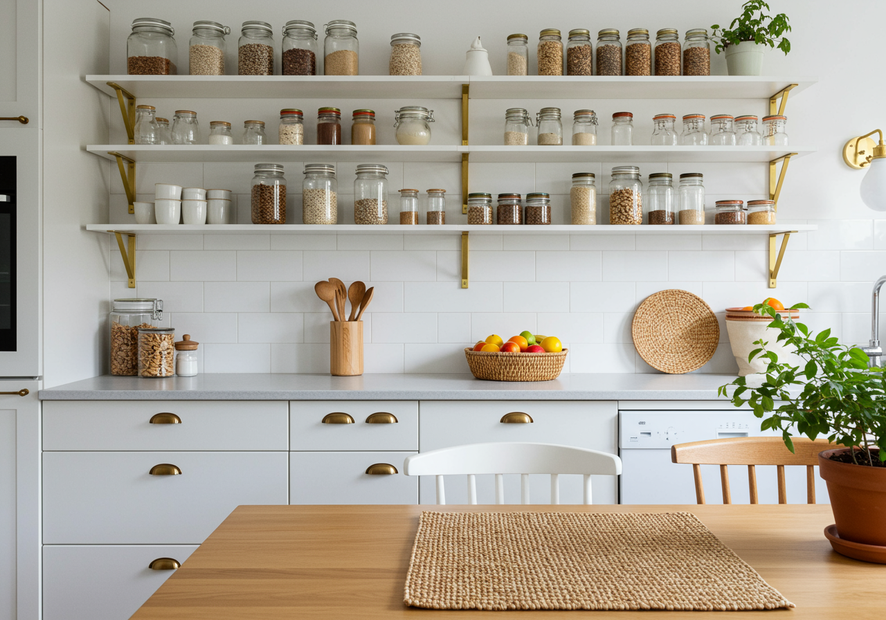 For a more homey, farmhouse feel in your kitchen, look for ways to add texture to the space, such as laying down a braided rug, displaying glass jars filled with dry goods on the countertop or using a woven basket as a fruit bowl.