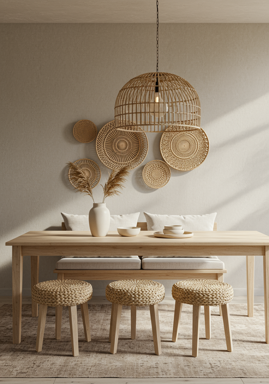For smaller items, like glass bottles or baskets, group them as collections for bigger impact. In this home in San Anselmo, California, five baskets hung together as wall art pick up the woven textures of the pendant light and stools. The resulting neutral palette with lots of texture makes the room feel warm, informal and inviting.