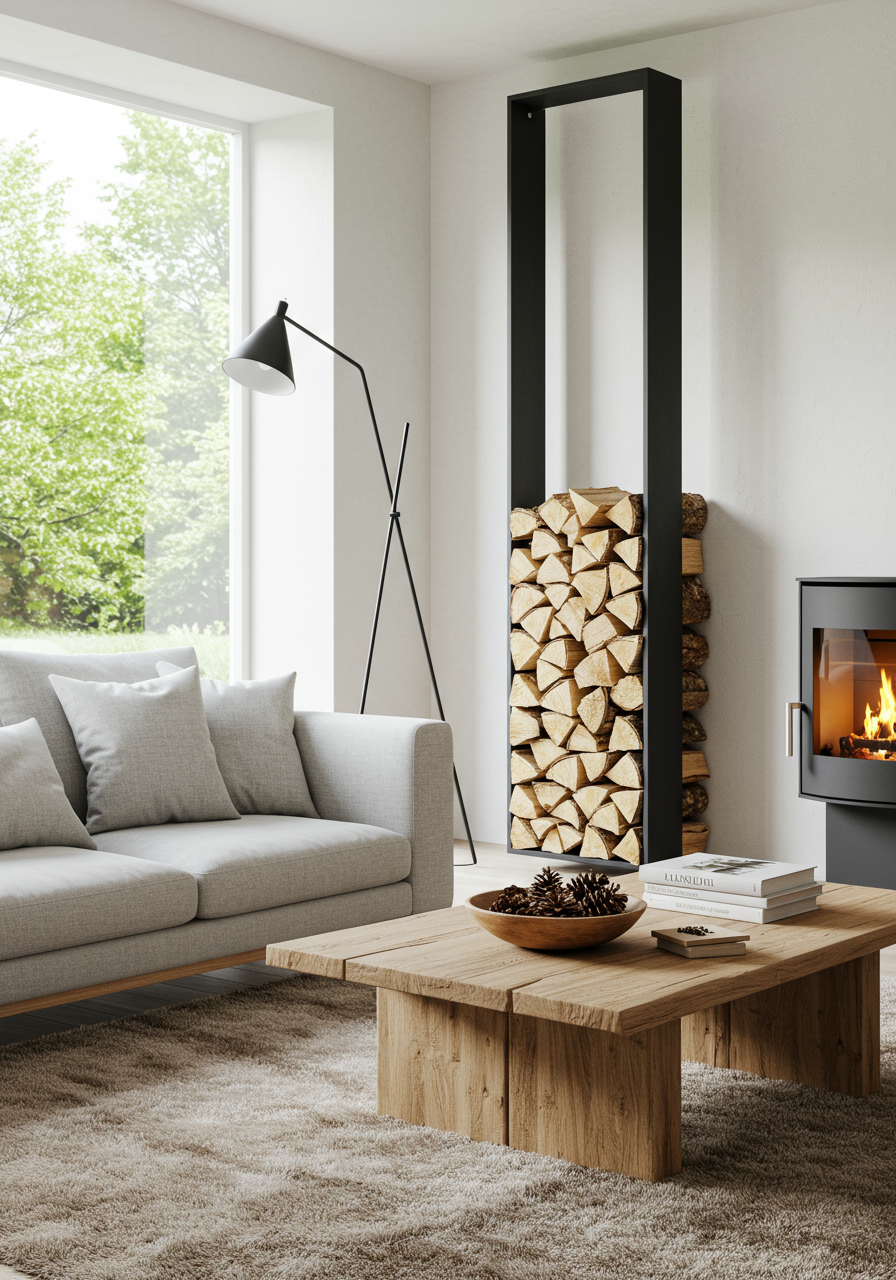 Using natural elements as accent pieces in the home sets a laid-back mood and can help modern spaces feel more lived-in. Here, a metal firewood rack is designed to show off the delicate peeling bark and rough texture of the logs as a wall-mounted sculpture.