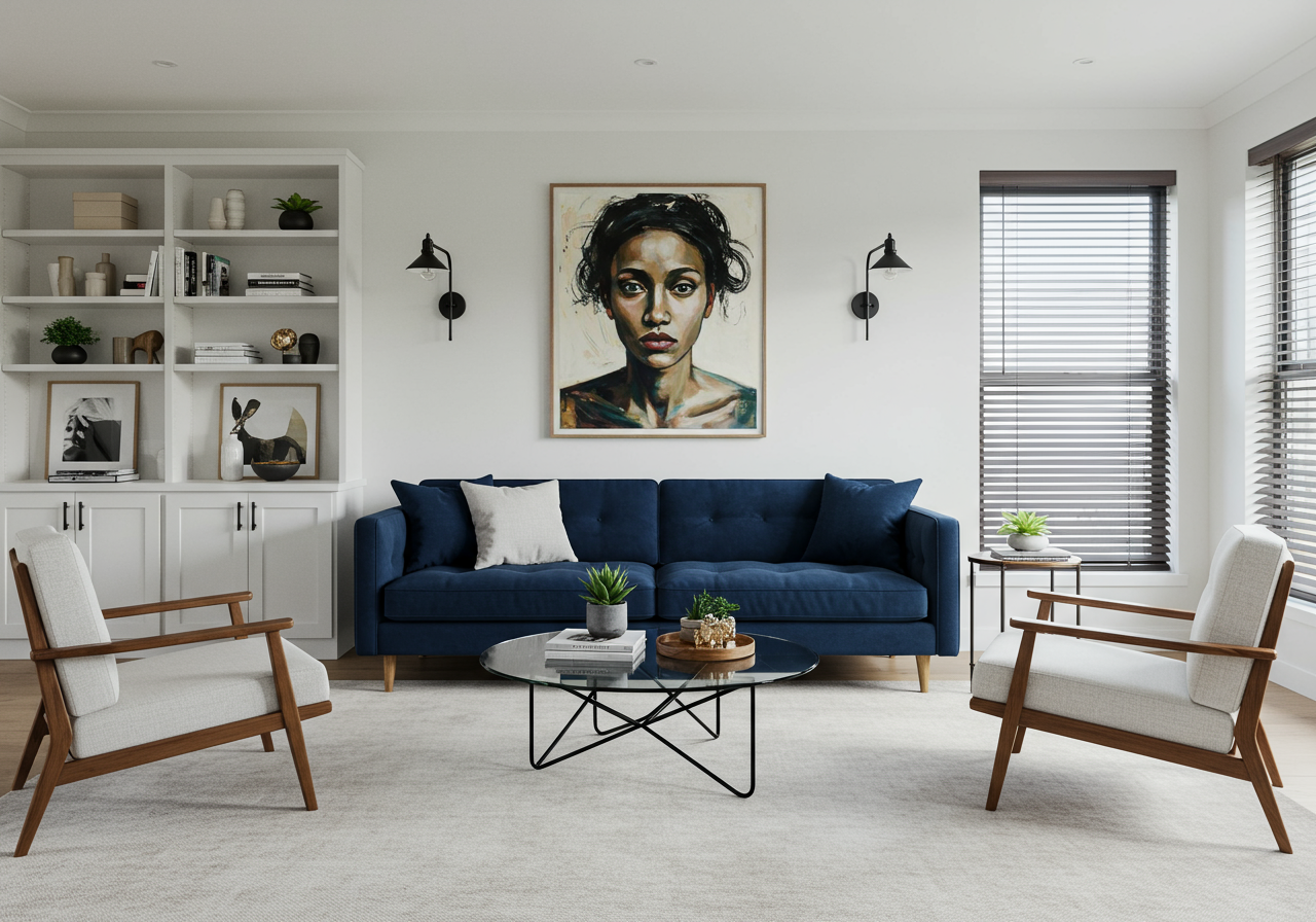 When it came to creating this living space, designer Ashley Darryl kept it simple, but punched it up with thought-provoking art and a bit of color blocking. The white shell of the space provided the perfect stage for that killer blue velvet sofa and black, green and blue books create their own statement on the adjacent shelving unit.