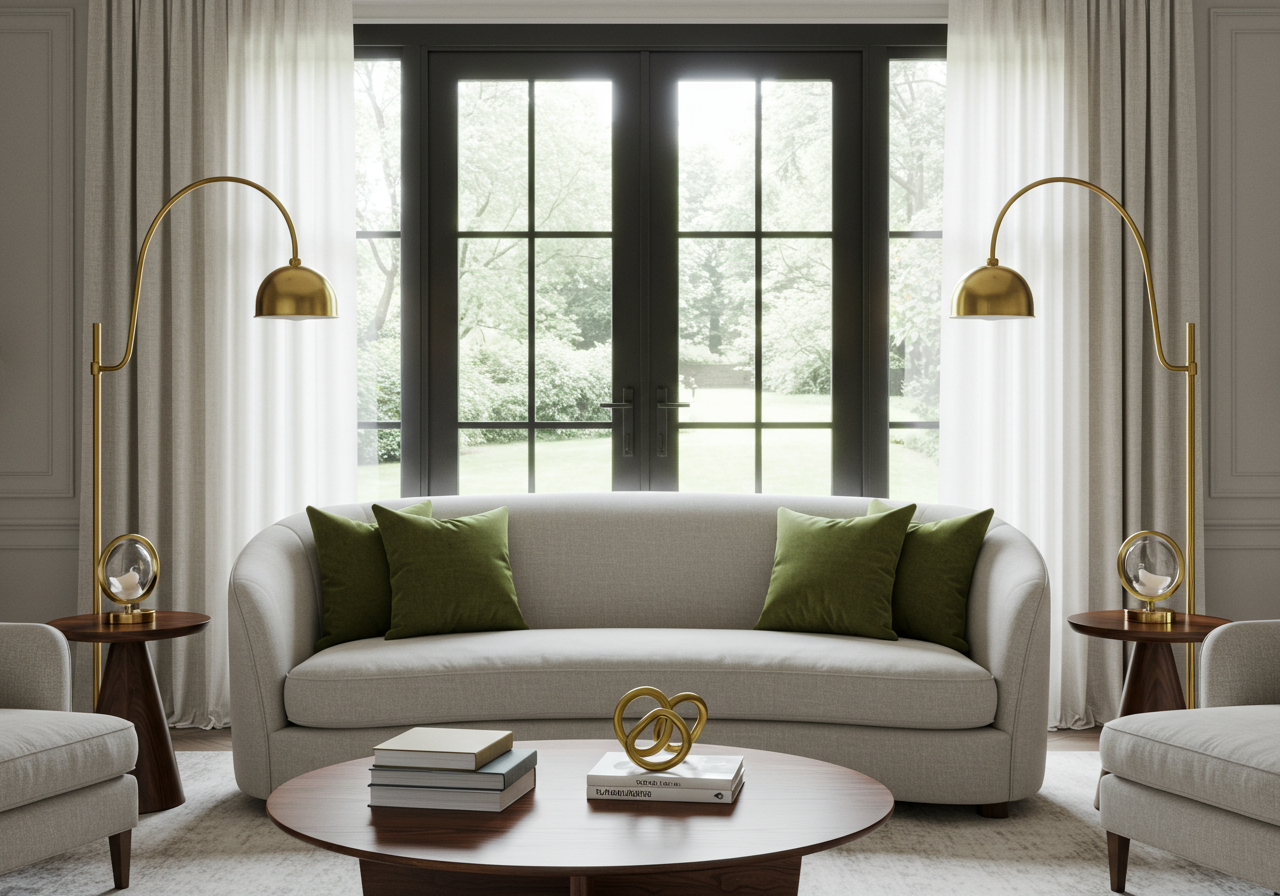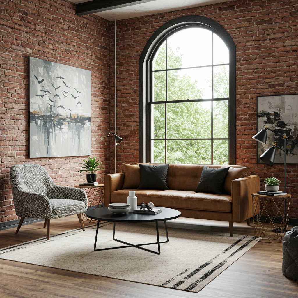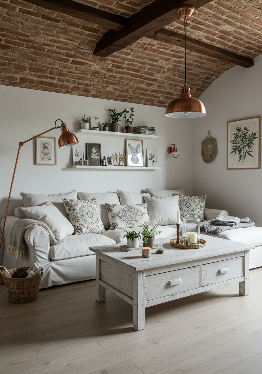 The contrast game is on point in this home designed by Brian Paquette. The richly tactile brick wall sets the stage for its softer counterparts like the plush sofa, soft wood coffee table and brushed brass accents, proving that a simple room can also feel quite layered and lively.