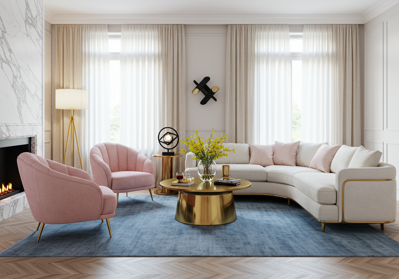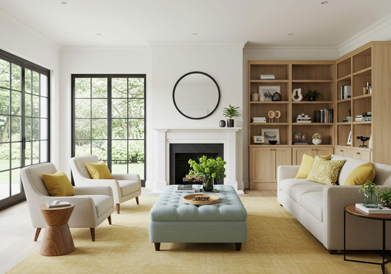 Here’s a way to make a white-walled room look far more purposeful: paint the moldings and any other architectural detail (like the fireplace in this room by Studio DB) a light gray to create just enough contrast to keep things interesting (and echo those color choices throughout the selected furnishings and decor). With just two simple hues, this design team made quite an impact.