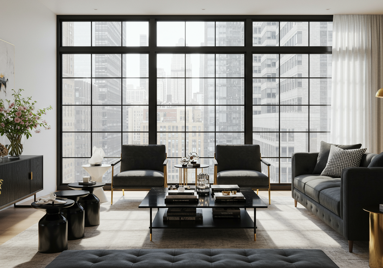 While everything in this New York room is exactly what you’d find in the typical living room—chairs, couch, TV, lamp, etc., you can tell that each piece was intentionally curated and provides personality to the room without being loud or colorful. The faux zebra area rug is also a fun touch that still works within this minimalist scheme, since after all, it essentially still adheres to a classic black-and-white color scheme.