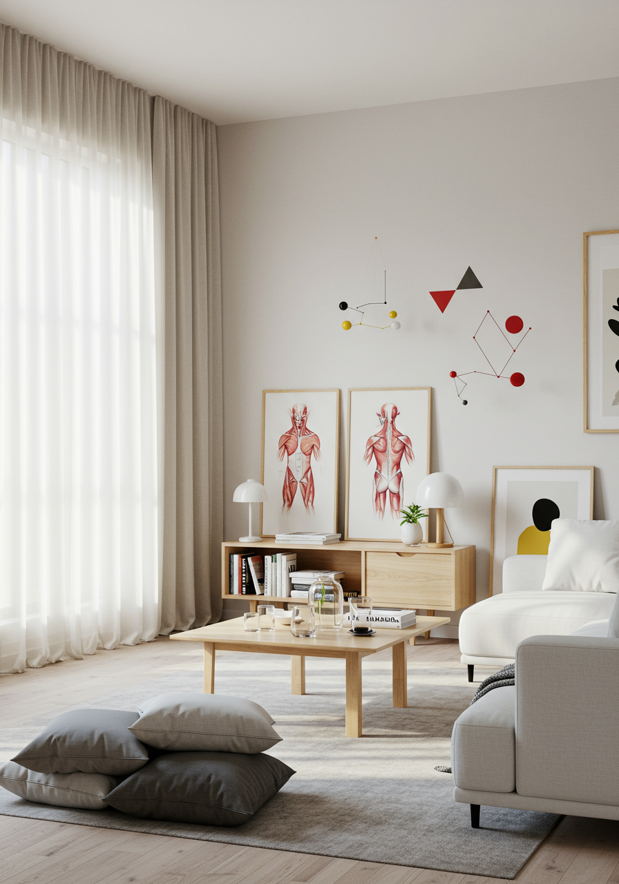 The unintrusive pop of color from the mobile hanging in this chic Valencia home is the perfect example of how to use brighter shades in accordance with minimalist principles. Warm-toned wood accents are also helpful in making this gray space feel a bit more homey without losing its simplicity.