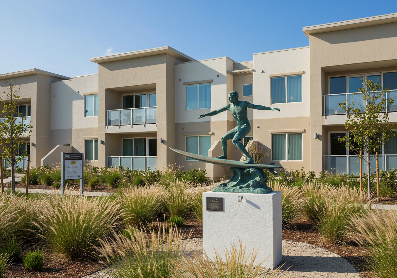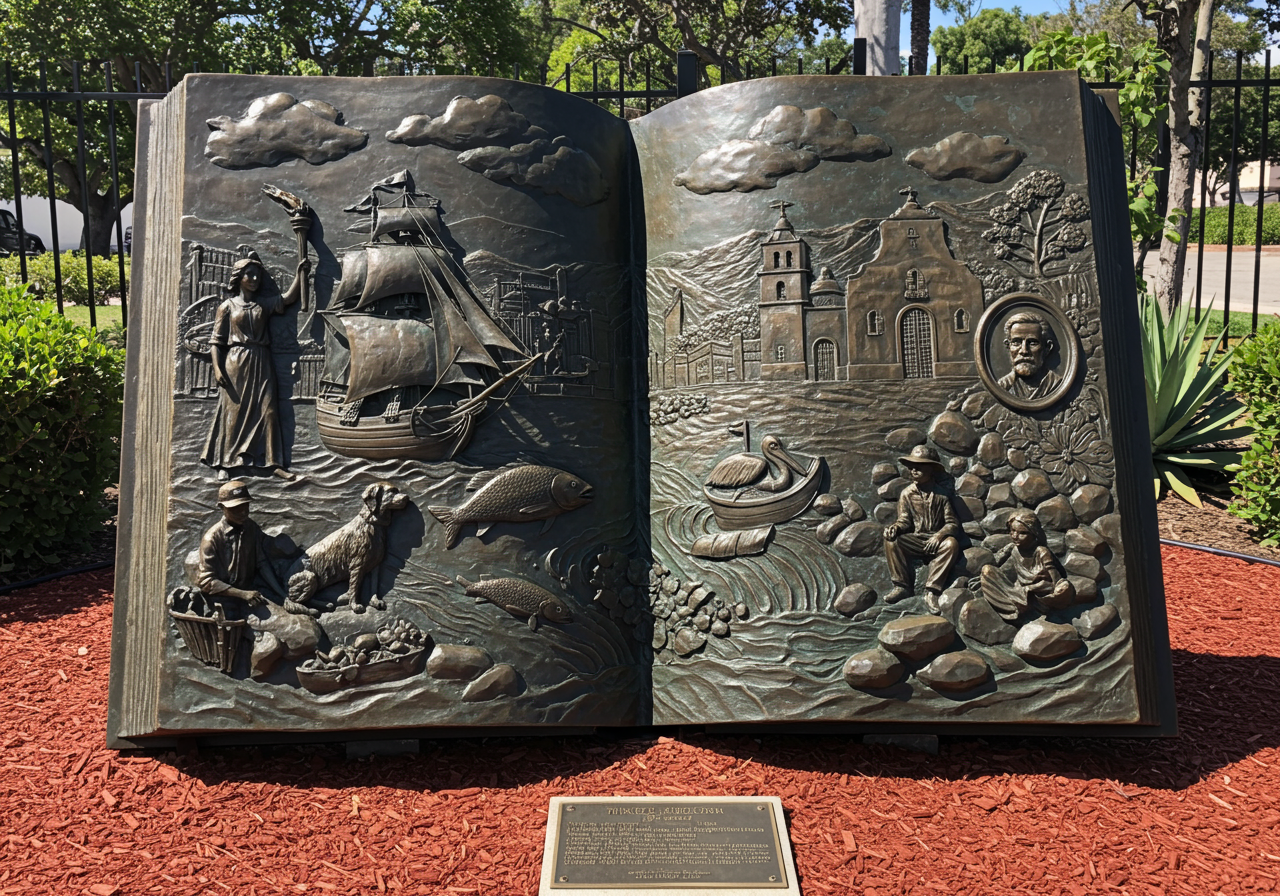 Established in 2018, Watermen's Plaza pays tribute to Dana Point's sailing and surfing heritage through interpretive displays, statuary and other art. Its most striking feature is a bronze statue designed by local artist Lance Jost and sculpted by local artist Bill Limebrook, called "Hobie Riding the Wave of Success" — a memorial to Hobie Alter, "The Surfboard King" who opened SoCal's first surf shop in Dana Point at 34195 Pacific Coast Highway (now part of the Cali Costa cantina next door). Alter also created a small catamaran you could sail (or race) with a two-person crew — the world-renowned Hobie Cat.