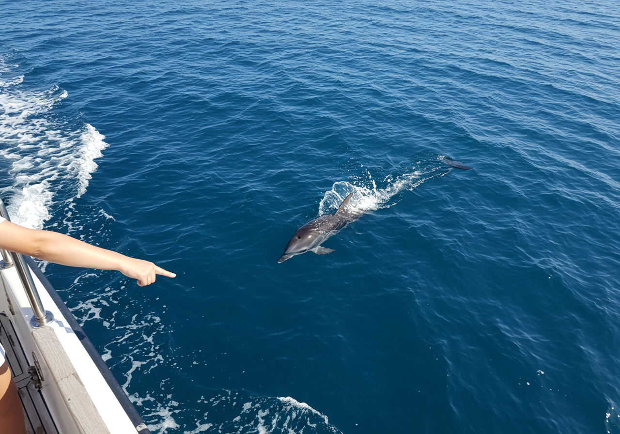 A passenger onboard Capt. Dave's catamaran points at a dolphin swimming alongside the boat. | Sandi Hemmerlein