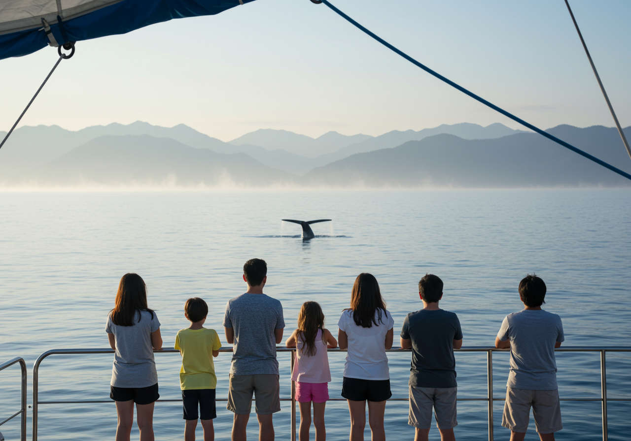Passengers onboard the Manute'a watch a nearby whale spouting water out of its blowhole. | Sandi Hemmerlein