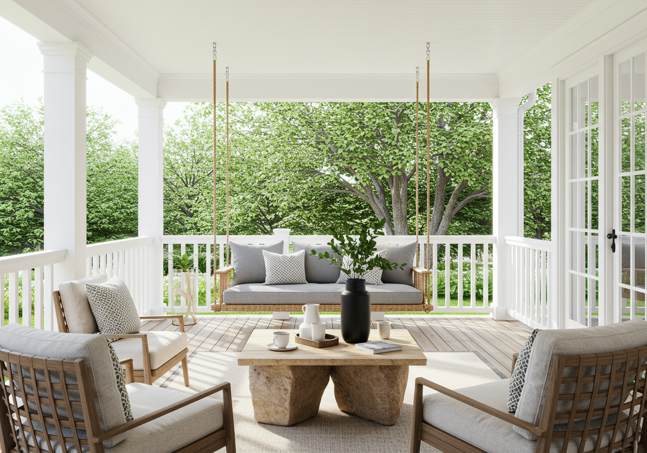 There’s nothing more charming to me than a porch swing. It never fails to make me feel like I’m the lead actress in a straight-to-streaming Lifetime movie, and I am here for it. However, I sometimes feel like porch swings can feel a bit… forgotten? Like someone just hung them there, but didn’t take the time to truly blend them in with the rest of the design. Not this one from The Edgartown Inn on Martha’s Vineyard. I love how the swing plays a larger role in the small porch scene, creating a cozy mini lounge area for guests to hang. Mimic the look with your own porch swing (I love the one below from Polywood, which is totally weather-resistant and made using recycled plastics), plus a low coffee table and a few additional chairs.