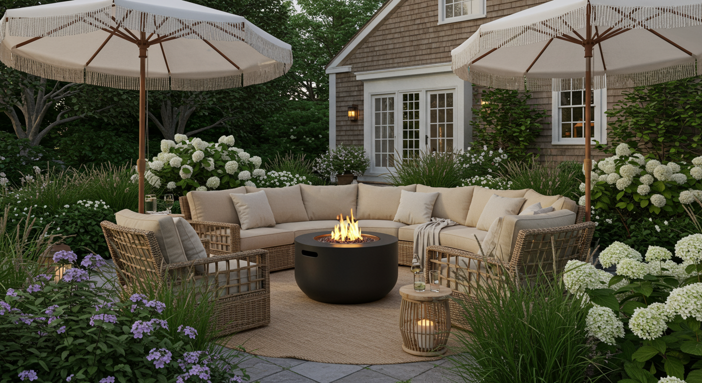 If you’re stumped over how to layout your outdoor space, opt for an arrangement that closely mimics what you would do in a traditional living room (especially if you have enough square footage to do so). The dreamy scene above is from The Life House Hotel on Nantucket, and I love the way it closely resembles an indoor hangout zone. Two sets of rattan couches and a few strategically placed side tables face each other, all centered around a focal point — only instead of it being a television, it’s a roaring fire pit. The end result is a seating area just begging for a crowd to show it a good time.