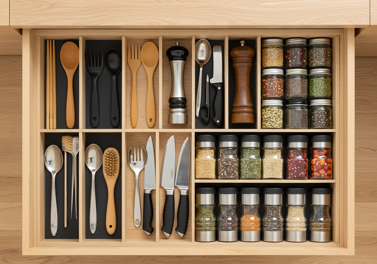 Internal drawers. Internal drawers are exactly what they sound like they should be. When you open the cabinet, you’re immediately confronted with drawers hidden just inside the door. This can be handy for small items, or if you’re not entirely sure what you want to stash inside your cabinet. The enclosed construction is pretty flexible and allows you to add things like dividers, should you want to toss your entire spatula collection in one, for example.