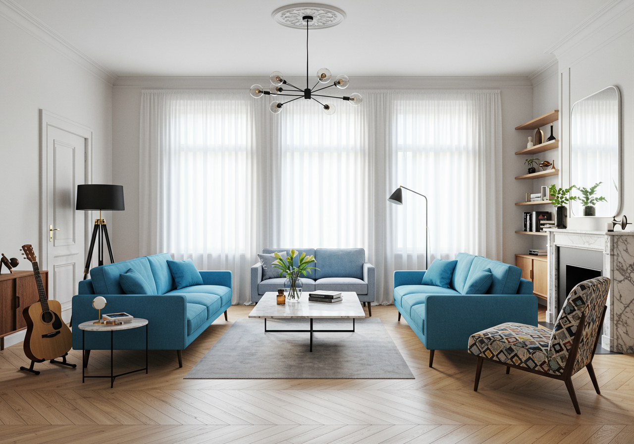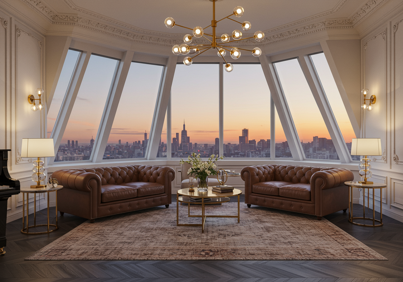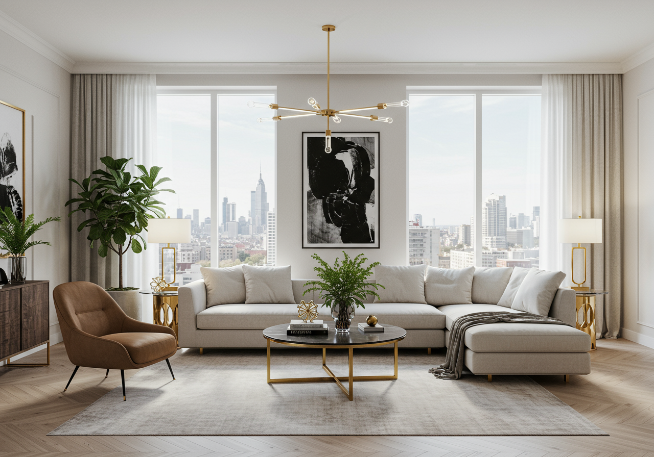 Although an unconventional tactic, another luxurious living room setup involves utilizing the corner of the room. This area can use a perfectly sized sofa, an elegant chandelier, and a matching coffee table to bring the space together effectively.
