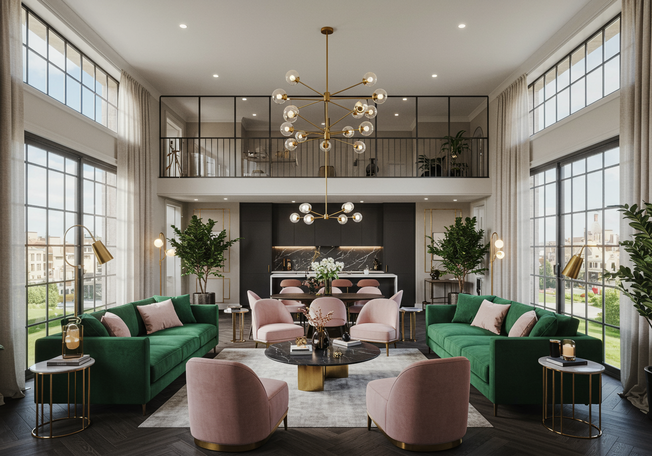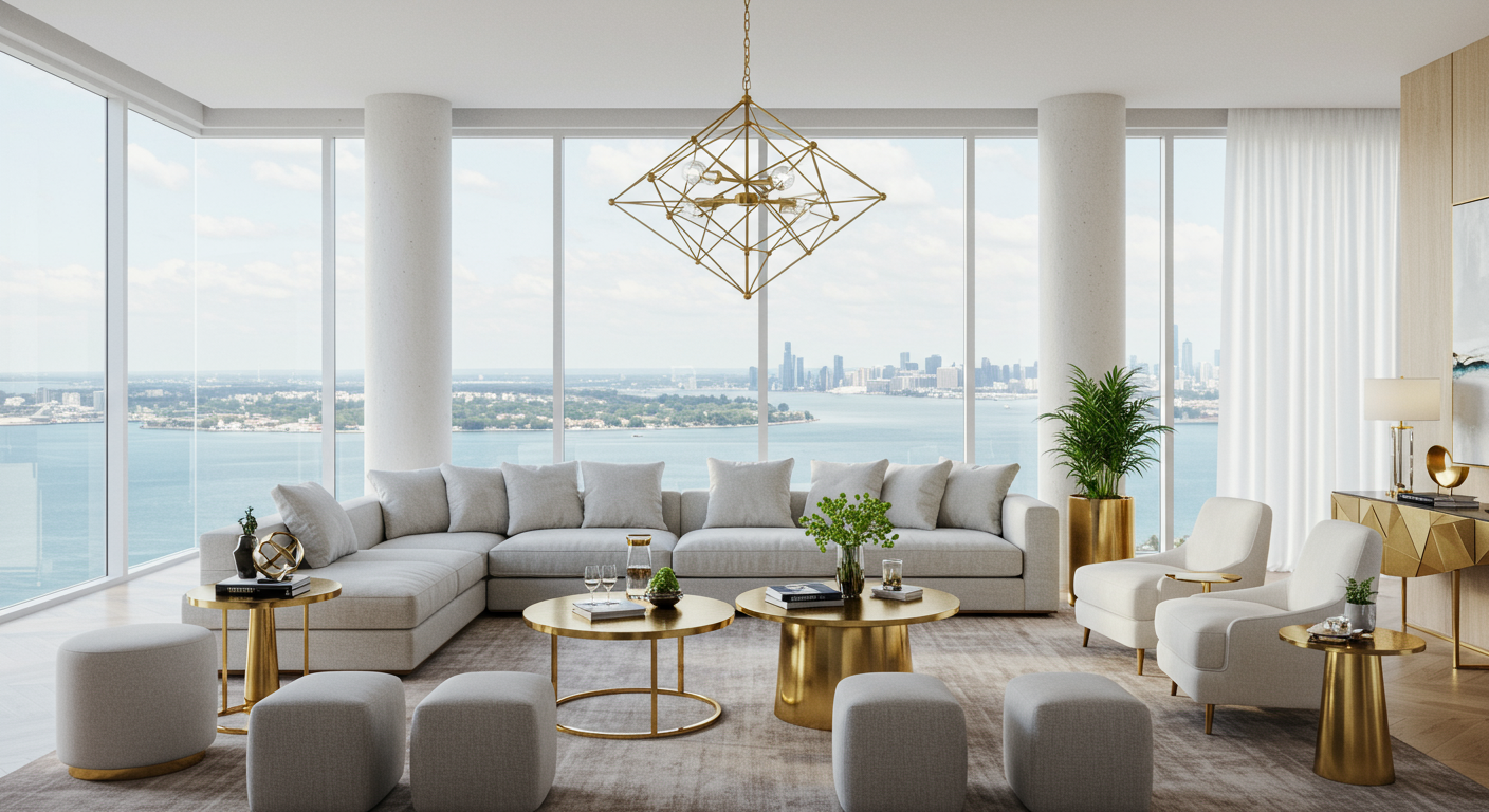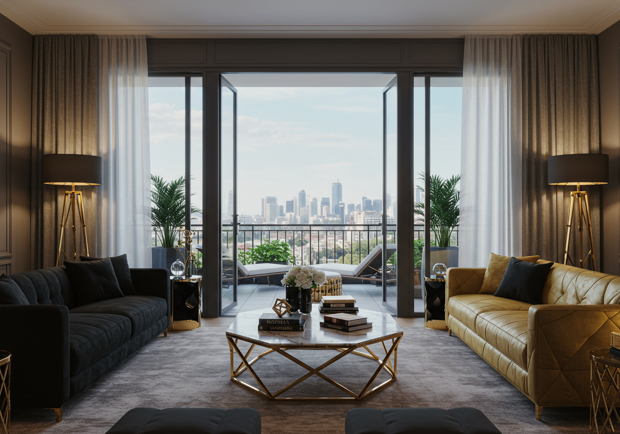 Although an unconventional tactic, another luxurious living room setup involves utilizing the corner of the room. This area can use a perfectly sized sofa, an elegant chandelier, and a matching coffee table to bring the space together effectively.