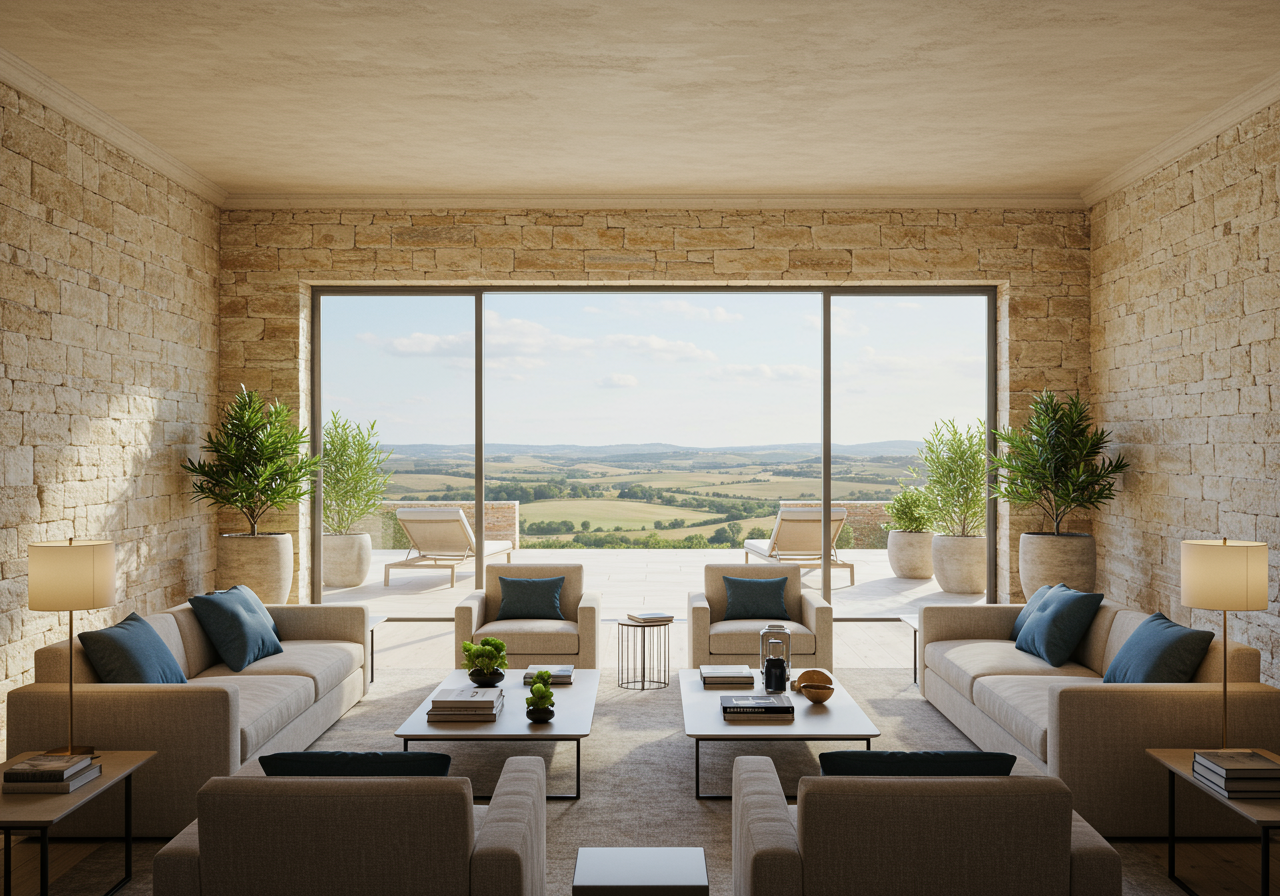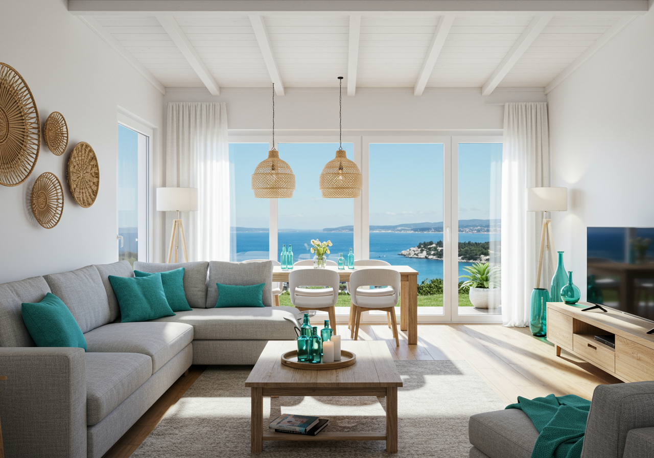 How about some Greek coast vibes? Adding white stone walls, blue-colored furniture and light colors throughout can create a Greek island appearance that looks incredibly luxurious.