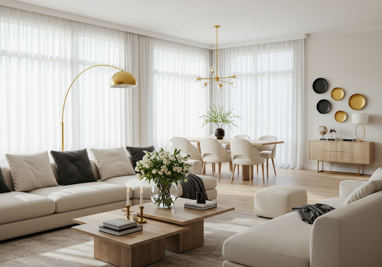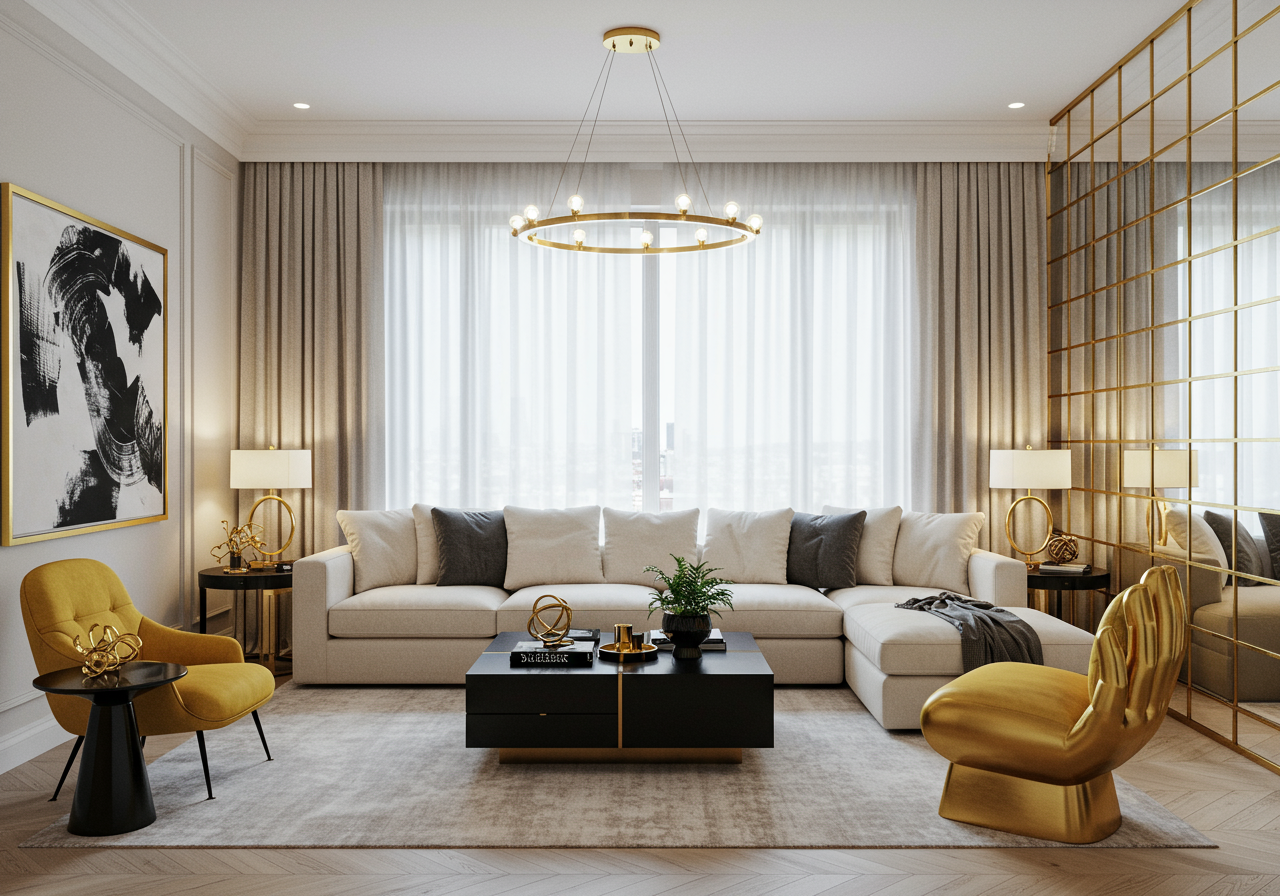 Gold is one of the most luxurious materials out there. While you don’t need to find real gold, adding gold-like accents can really help to create a modern, luxurious feel in a living room.