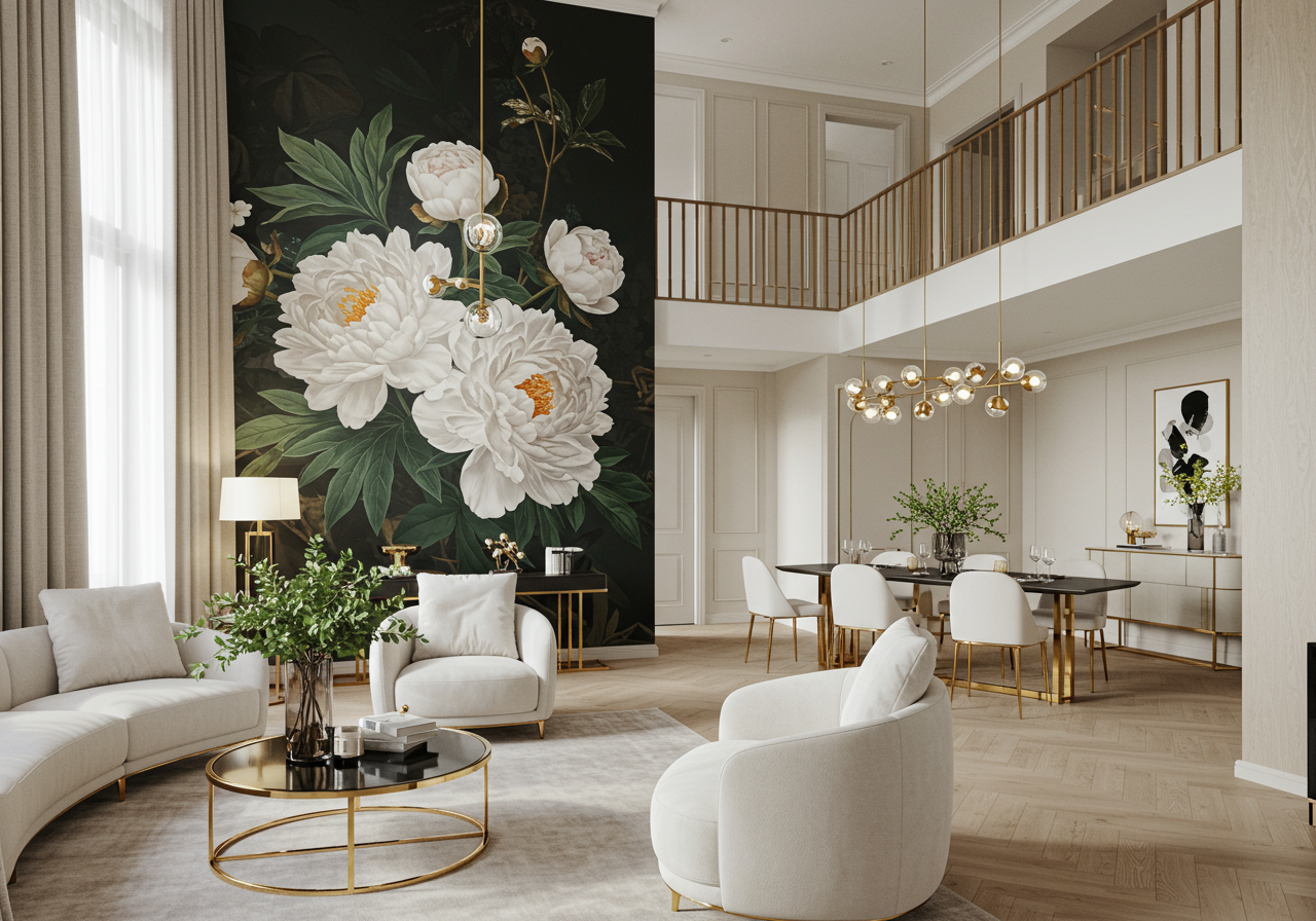 Another unconventional idea is to add a mural covering a large area on a living room wall. If combined with the right design elements and furniture, this look can be very luxurious.