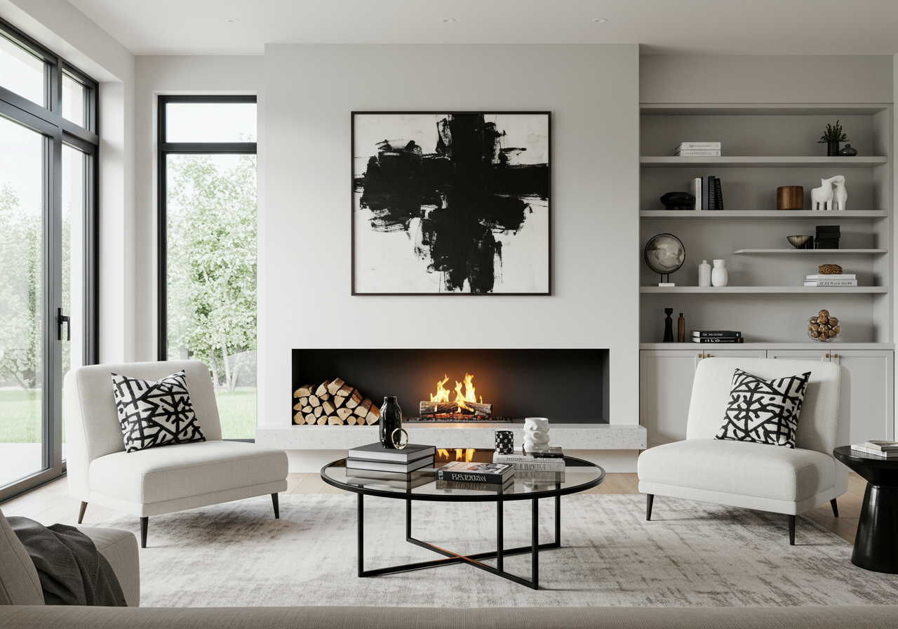 High-contrast living rooms are on the rise. Blending together deep blacks with warm whites can really make a bold statement in any modern living room.