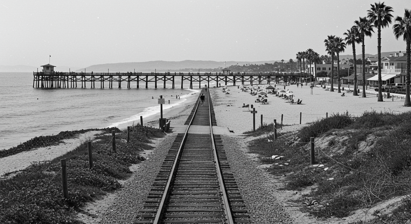 The final photo captures the iconic San Clemente pier and beachfront during the 1930s. The pier, with its wooden planks and the railroad running parallel to the beach, highlights how connected the town was to the ocean. This scene exemplifies the simple, beachside lifestyle that Ole Hanson wanted to cultivate for residents and visitors alike.