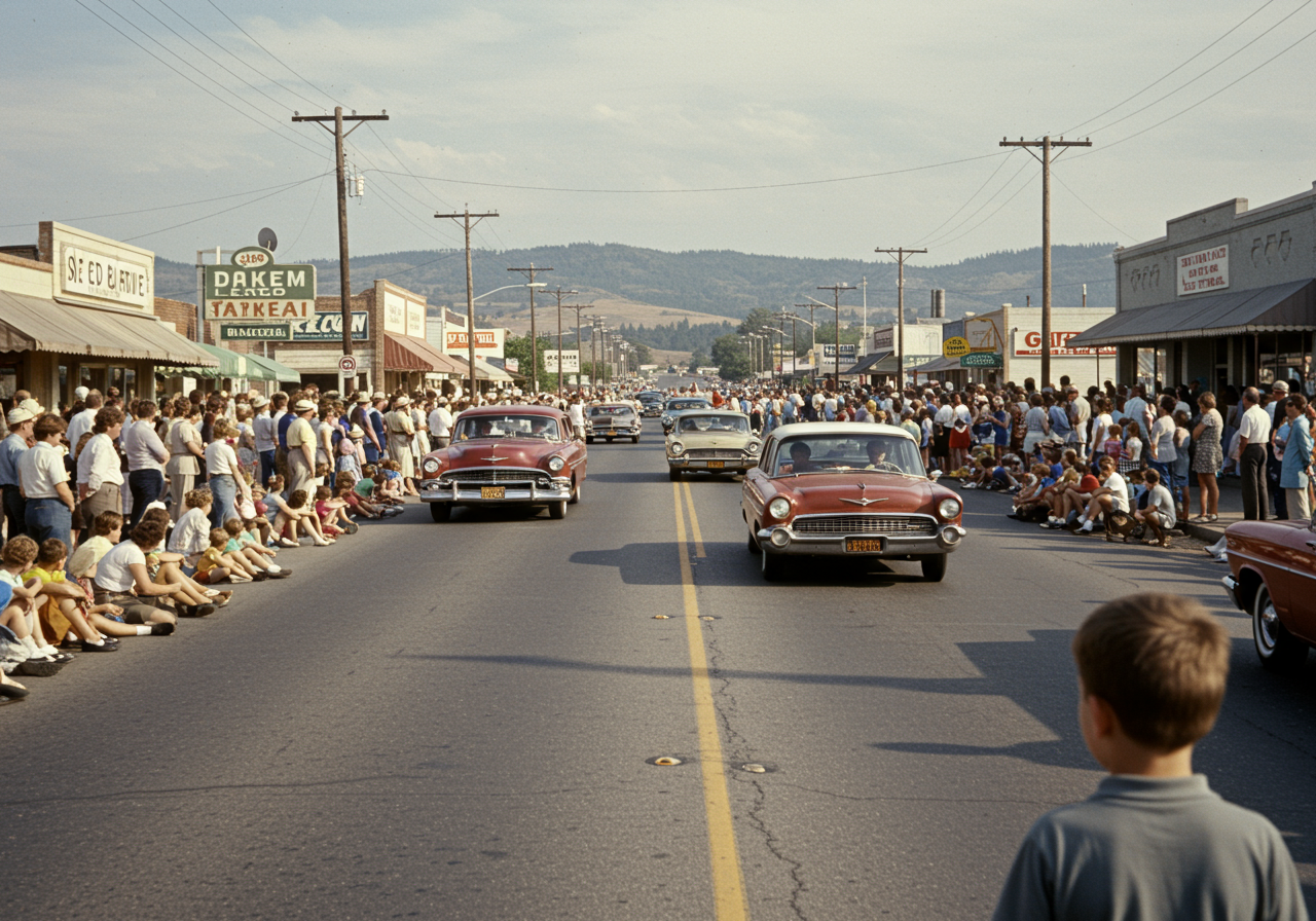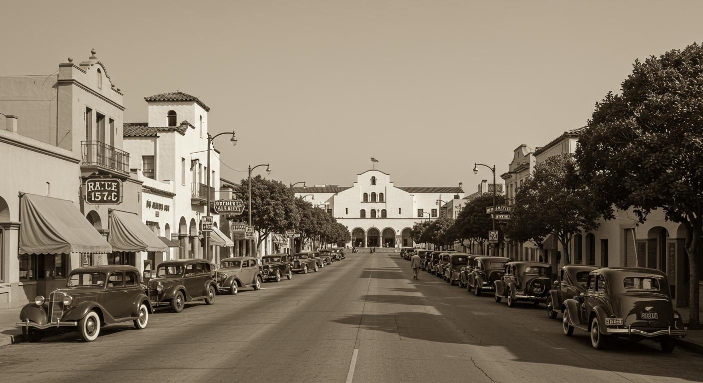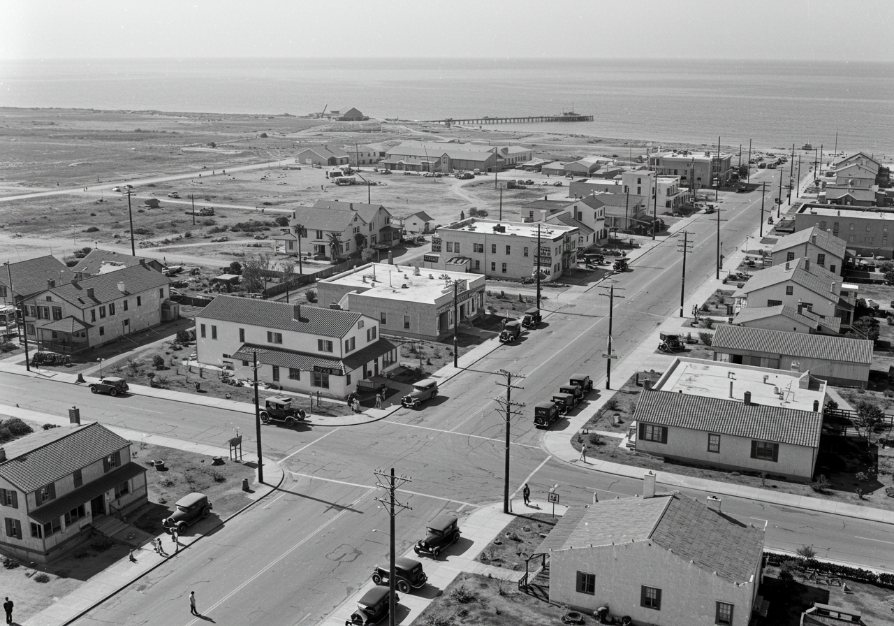 At the end of the street, we see a marquee advertising a local theater, which was likely a central hub for entertainment during this time. The architecture, the calm streets, and the burgeoning culture all contributed to the town’s identity as a peaceful yet vibrant coastal community.