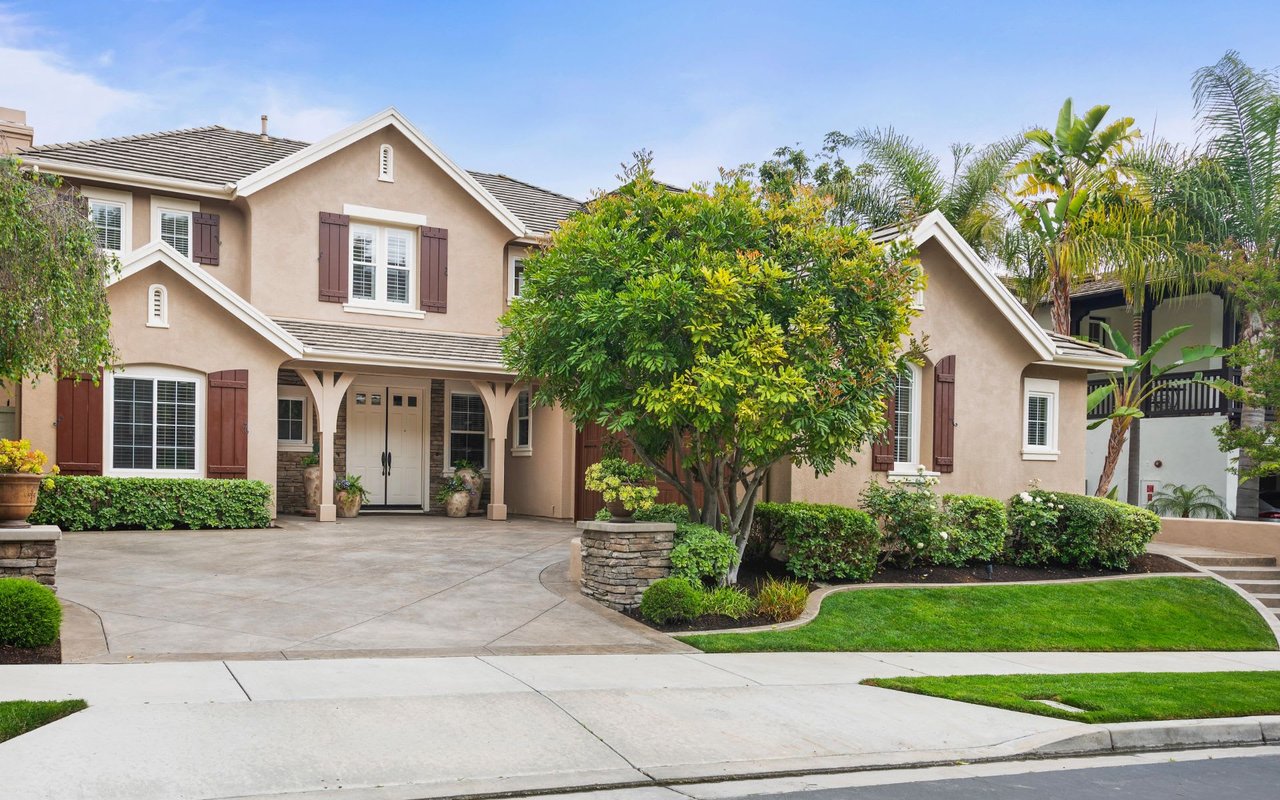 Achieve the pinnacle of style in this fresh, inviting and luxurious home at Talega of San Clemente’s enviable Pacifica Summit enclave. Dual entry doors open to a two-story foyer with impressive staircase and interior French doors that lead to a library with custom built-ins. Continue to a spacious living and dining area with elegant fireplace and backyard access, providing ample space for memorable entertaining. Five bedrooms and four-and-one-half baths are featured in the two-level design of approximately 3,886 square feet, including a main-floor ensuite with window seat. Kick back in a stylish family room with custom built-in entertainment center and a fireplace with extended brick hearth. Open to the family room, a fully appointed kitchen exhibits dark-stained wood cabinetry, an island, built-in desk, oversized walk-in pantry with window, and upgraded appliances. Tumbled-edge tile, hardwood and designer carpet embellish floors, and crown molding, plantation shutters, wainscoting, and ceiling-mounted speakers enhance select areas. Take in hill and city-light views from a master suite with deck, walk-in closet, granite countertops, a soaking tub, dual vanities and separate shower. Overlooking the community with nobody located directly behind, grounds of about 7,886 square feet include a manicured backyard that hosts a covered patio, flagstone decking, and a front yard with a decorative stamped concrete driveway.
