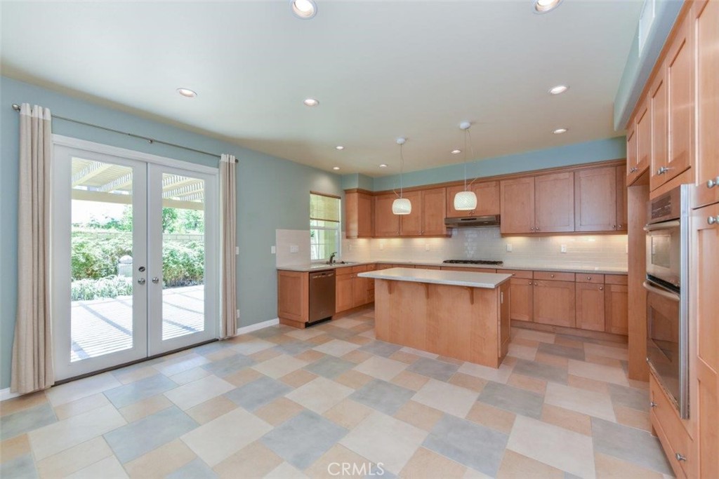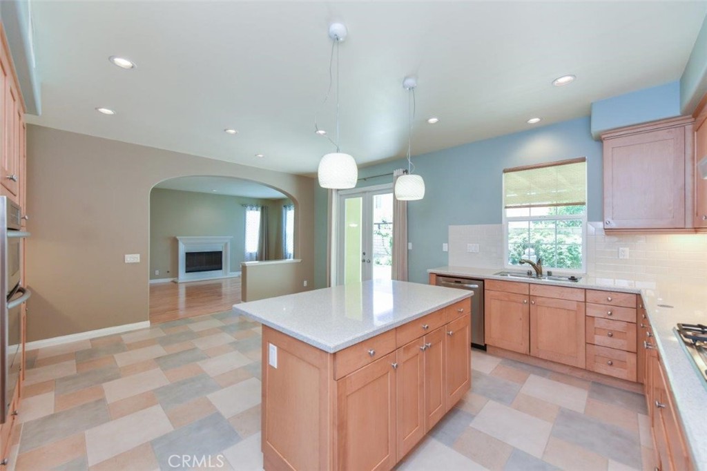 Experience this spacious and open floorplan in the delightful community of Woodbury in Irvine. On the main floor you will enjoy a large family room w/cozy fireplace, a generous open dining area w/built-in desk and French doors to an expansive covered patio, a main floor bonus room/office (which can easily be converted to a 5th bedroom), powder room and a fully appointed kitchen w/gorgeous maple cabinetry, Caesarstone Quartz counters, large center island w/breakfast bar, and stainless appliances. The covered patio finished with colored concrete and slate border provides a wonderful spot for an afternoon BBQ, while the large grass area offers a place for kids/pets to play. The second level hosts 3 large bedrooms featuring European solid wood floors in a natural stain in addition to a luxurious master which boasts high-end wool carpet in a neutral tone, plantation shutters, recessed lighting, coffered ceiling and his/her closets.