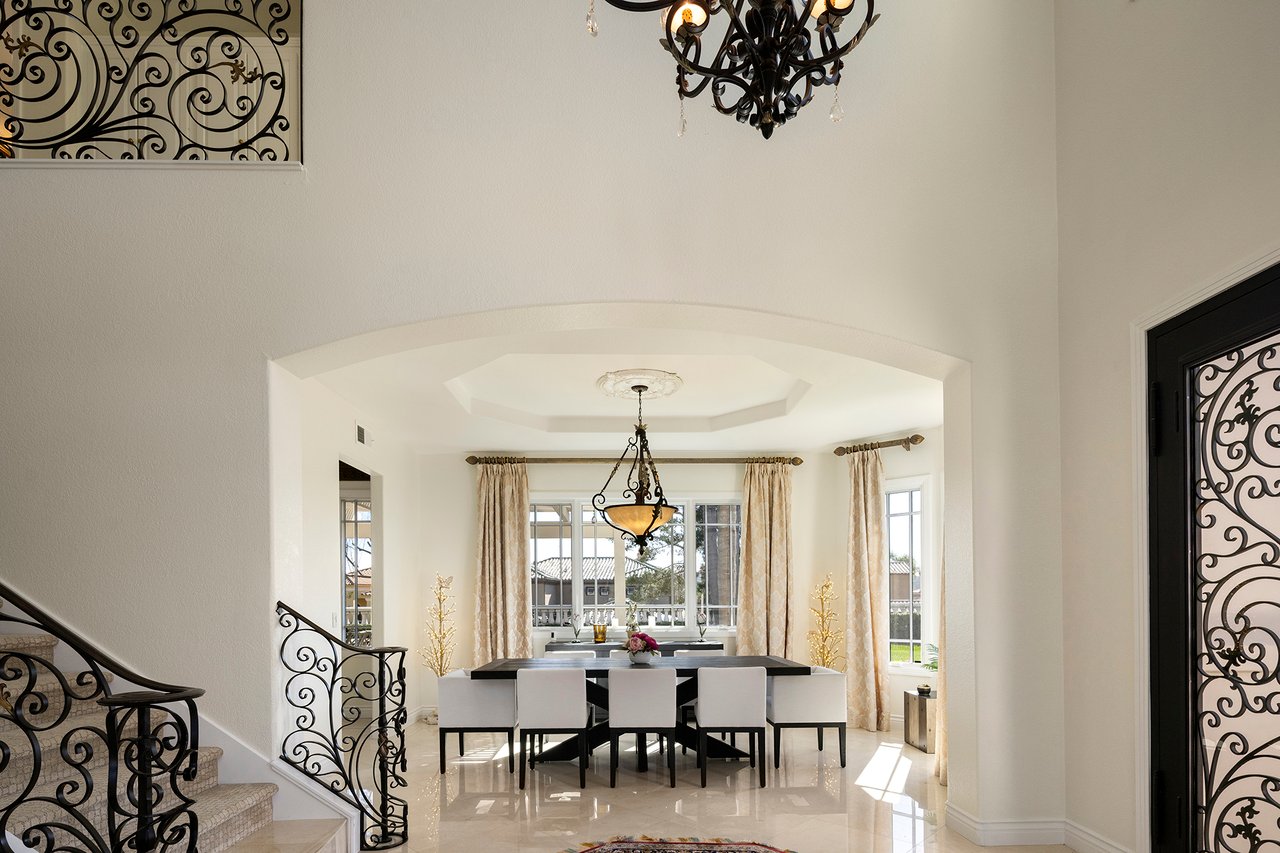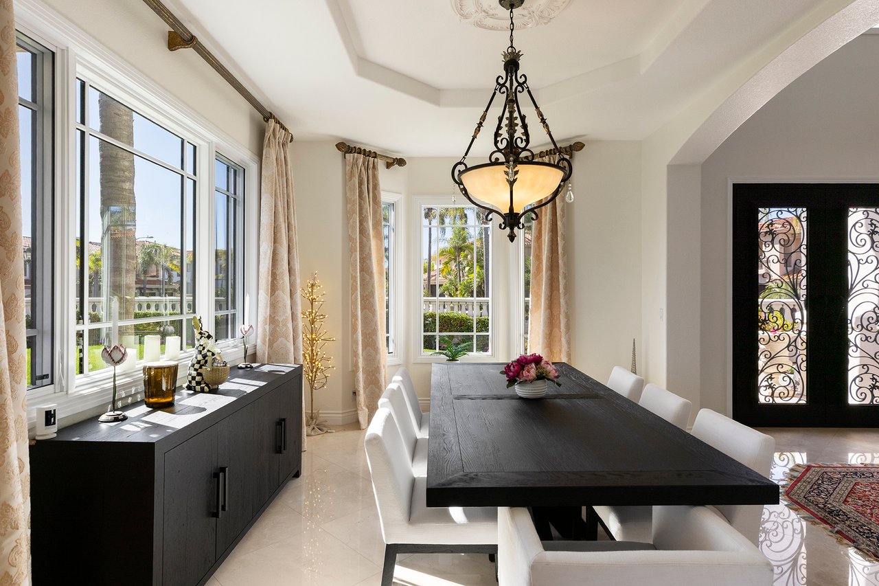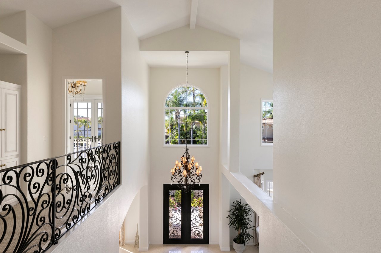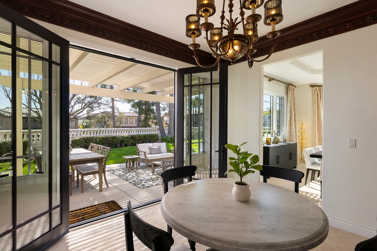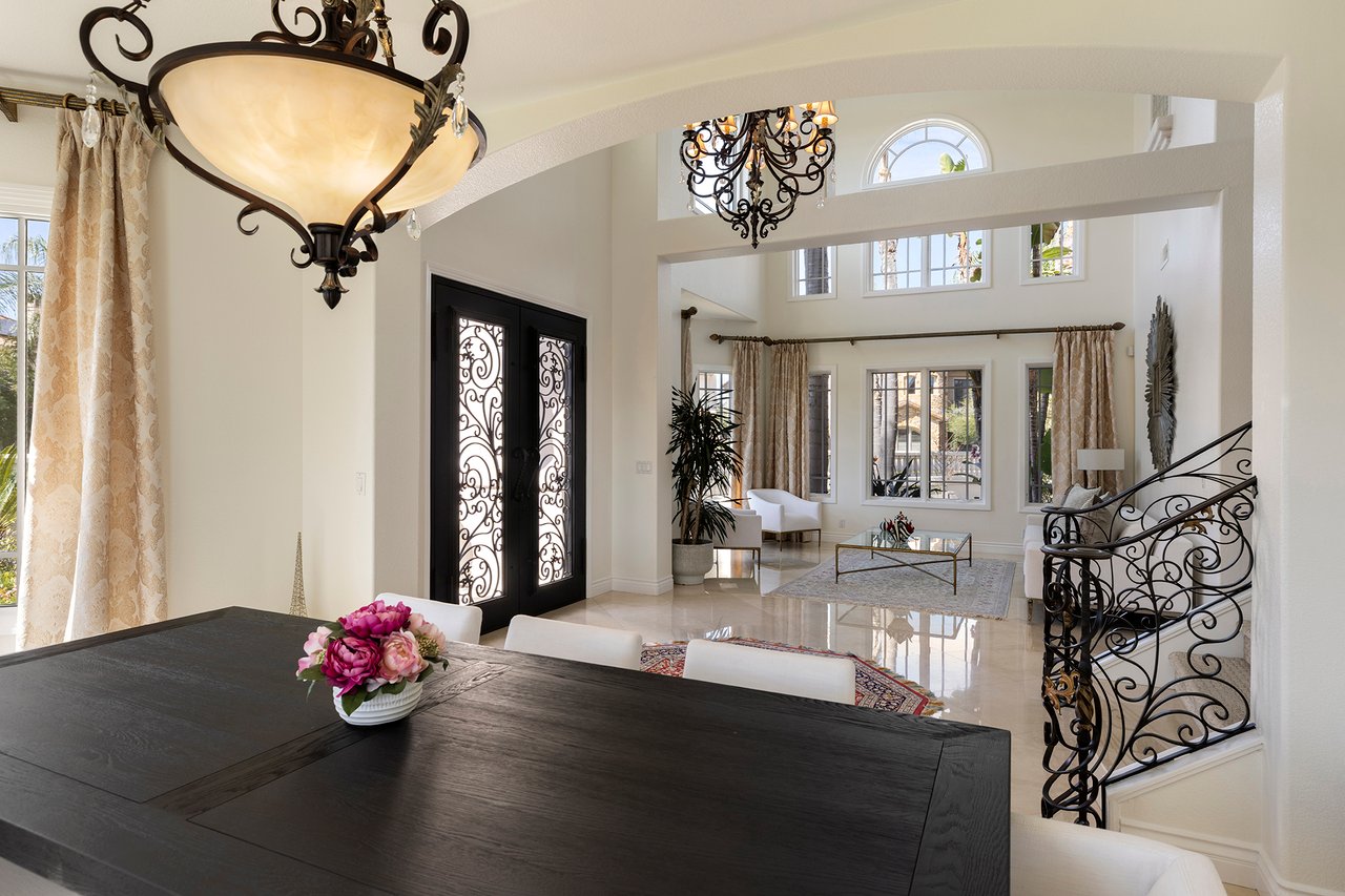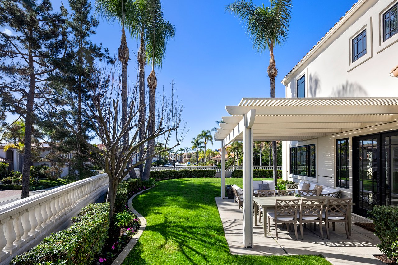Behind the gates of The Estates at Rancho Niguel, 14 San Rafael is a commanding corner-lot residence defined by architectural scale, refined detailing, and elevated coastal living. Encompassing approximately 3,403 sqft, this four-bedroom, three-bathroom estate blends grand proportions with livability in one of Laguna Niguel's most established gated communities. A dramatic double-door entry opens to soaring two-story ceilings, formal living and dining rooms, and a sweeping wrought-iron staircase that sets the tone for the home's craftsmanship. Marble flooring, crown molding, custom millwork, and a built-in wet bar create an elegant and inviting atmosphere. The family room, anchored by a fireplace and wired for sound, flows seamlessly into the kitchen, forming the heart of the home. The kitchen reflects European influence and enduring quality, appointed with custom cabinetry, marble countertops, a farmhouse sink, center island, walk-in pantry, and professional-grade appliances including a Wolf range and Sub-Zero refrigerator. A breakfast nook framed by French doors opens to the backyard, extending everyday living outdoors. A main-level bedroom and full bath provide flexibility for guests or multigenerational living. Upstairs, the primary suite offers impressive volume, its own fireplace, and access to a private balcony capturing hillside views. The primary bath evokes a spa experience with marble dual vanity, a custom-tiled walk-in shower, a jetted tub, and dual walk-in closets. The backyard is composed for privacy and presence, wrapped in balustrade walls and enhanced by landscape lighting. Covered and open seating areas allow for effortless entertaining beneath mature palms and open skies. The residence reflects meticulous care and investment, including windows, A/C system, front door and patio doors, Cove dishwasher, and landscaping drip system, along with a prior full re-pipe -- offering aesthetic refinement and meaningful system upgrades. A three-car garage with epoxy flooring and built-in cabinetry completes the property with scale and polish. Residents enjoy exclusive access to The Club at Rancho Niguel, offering lighted tennis courts, heated lap pools, spa, gym, volleyball and basketball courts, clubhouse facilities, and community programming. Beaches, resorts, championship golf, premier dining, and highly regarded schools are nearby. A refined estate within a gated enclave designed for those who value space, privacy, and enduring quality.