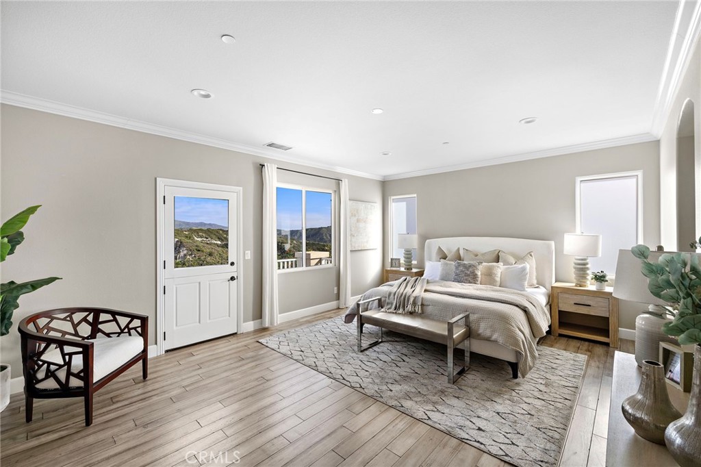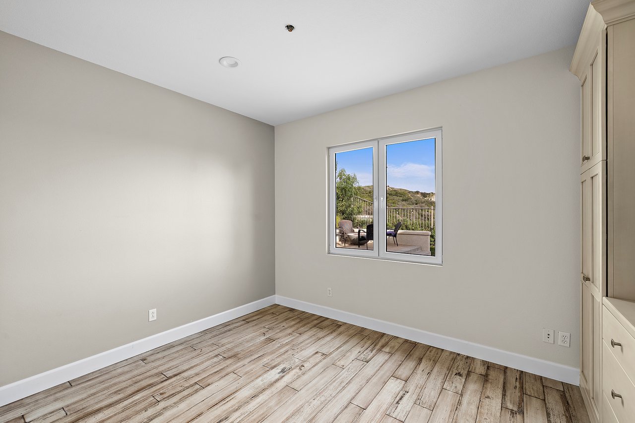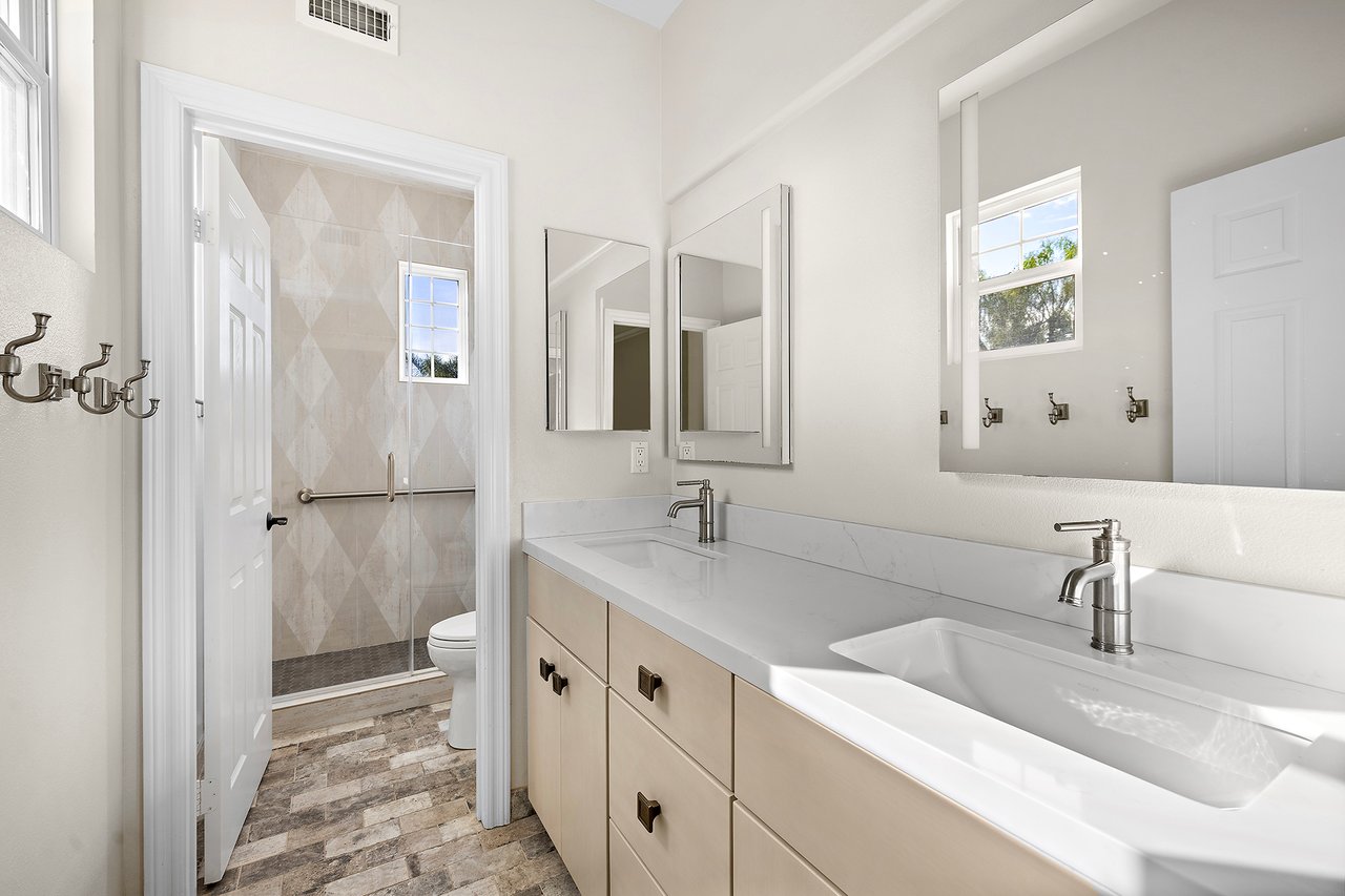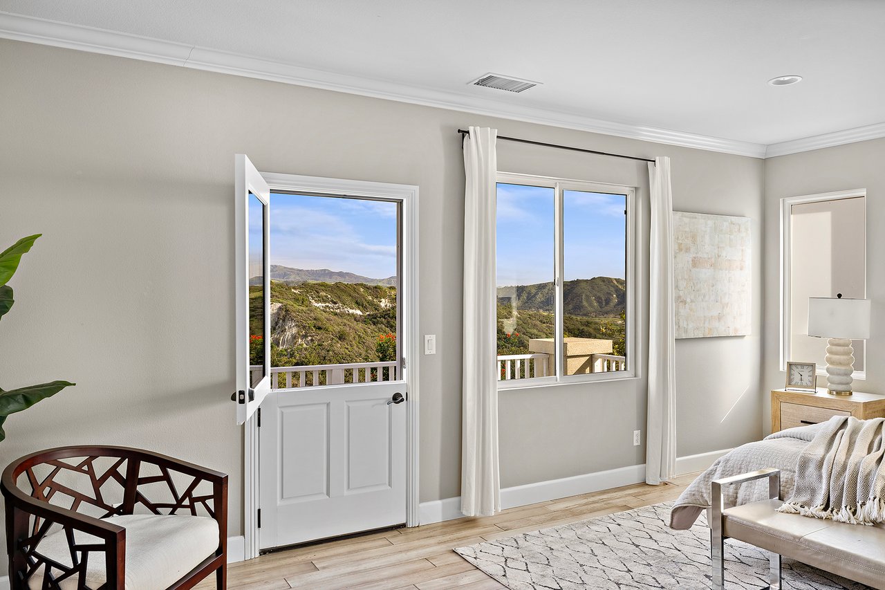 Upstairs, the primary suite is set apart as a private sanctuary. A Dutch door opens to a balcony with open canyon views and soft morning light, offering a peaceful setting to greet the sunrise. The spa inspired bath features dual vanities, a freestanding jetted tub, modern lighting, and two walk-in closets. Three additional bedrooms and a full laundry room with utility sink complete the upper level.