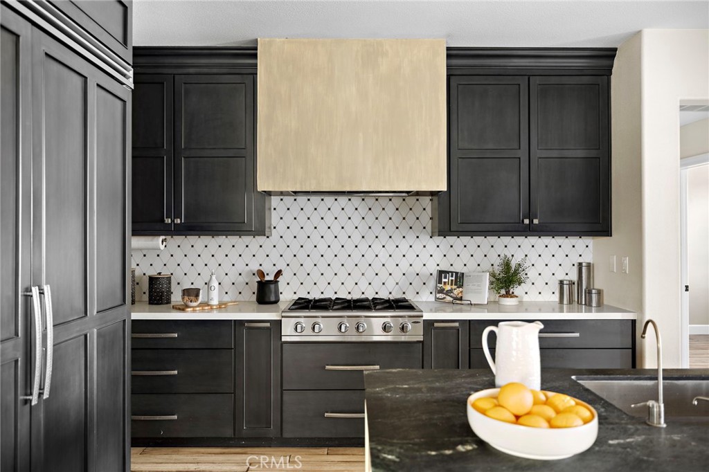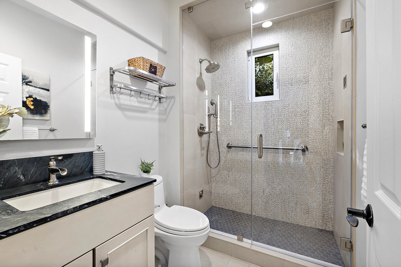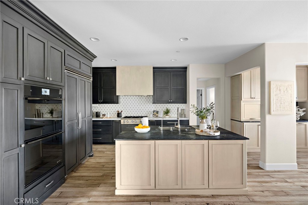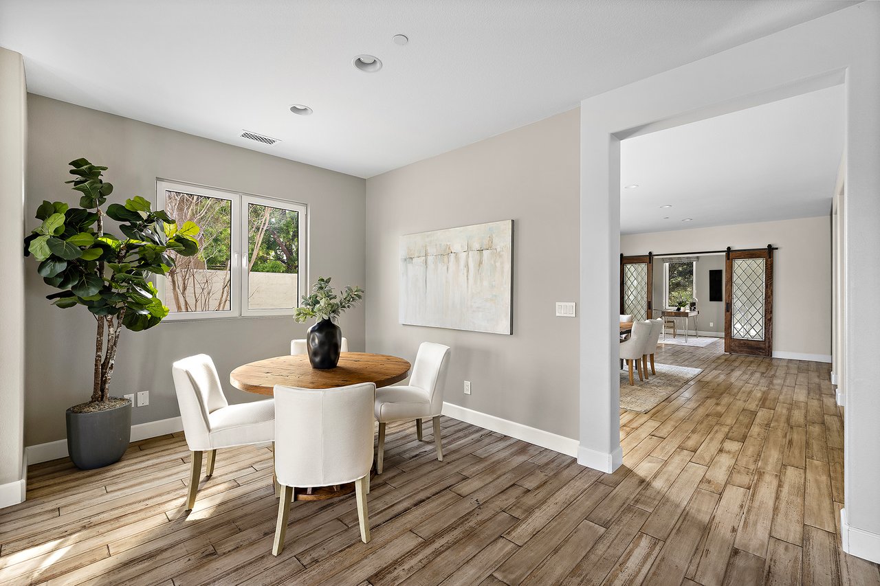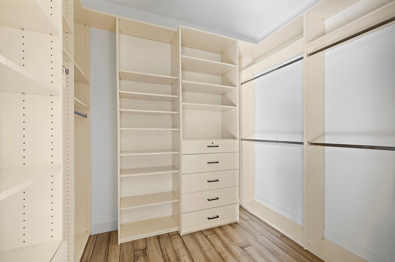 This five bedroom, three bathroom residence is anchored by a beautifully appointed chef's kitchen designed for both function and flow. Deep 42 inch storage drawers, discreet electrical outlets, and a custom pull-out system for pots and pans support everyday use, while a professional grade appliance suite including a 35 inch Capital range with hood, 48 inch Viking refrigerator, Bosch dishwasher, and JennAir Noir double ovens grounds the space with understated capability. A marble backsplash pairs seamlessly with quartz and soapstone countertops, complemented by a spacious walk-in pantry. Appliance garages at the breakfast bar keep coffee and kitchen essentials neatly tucked away, preserving clean lines and visual calm.