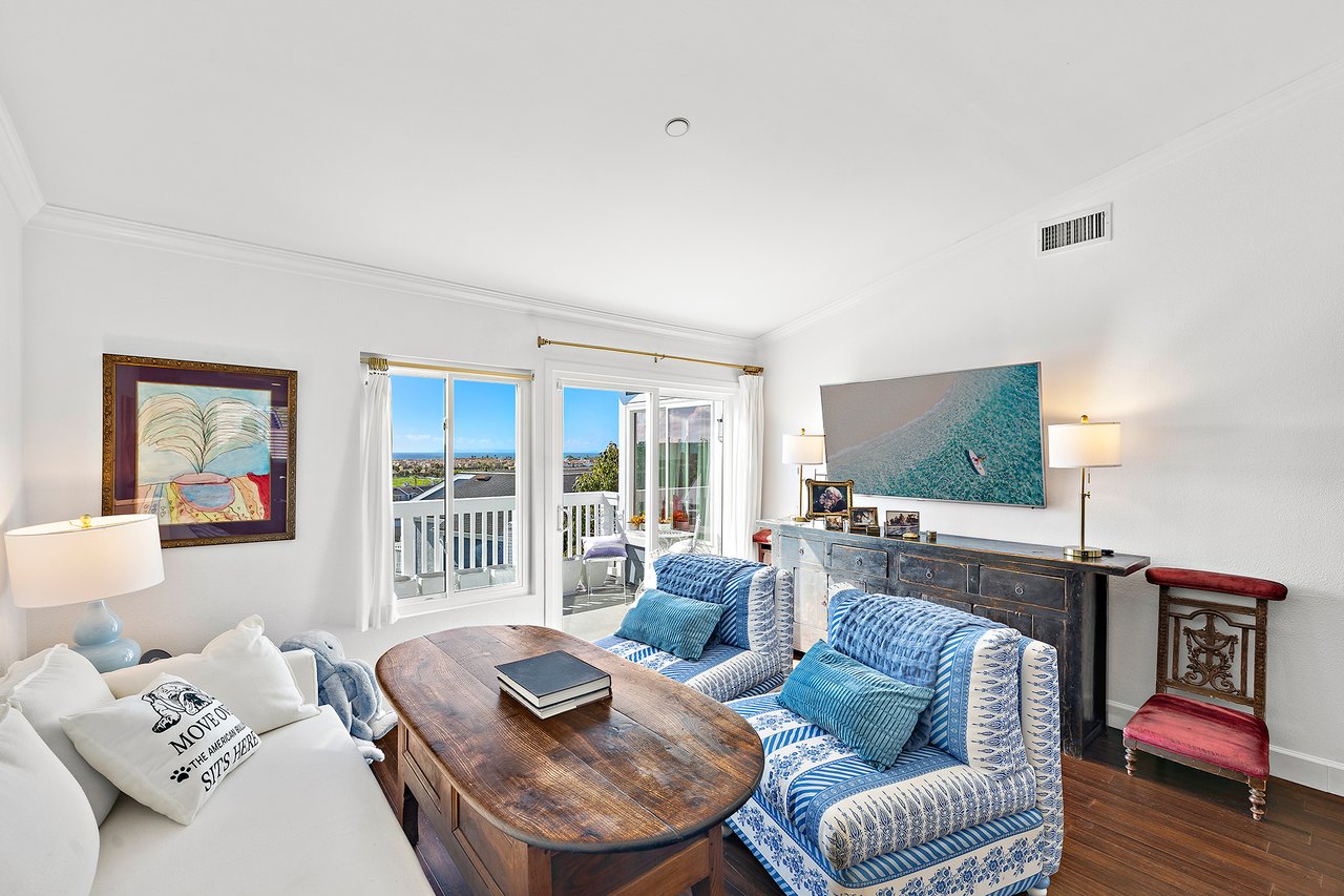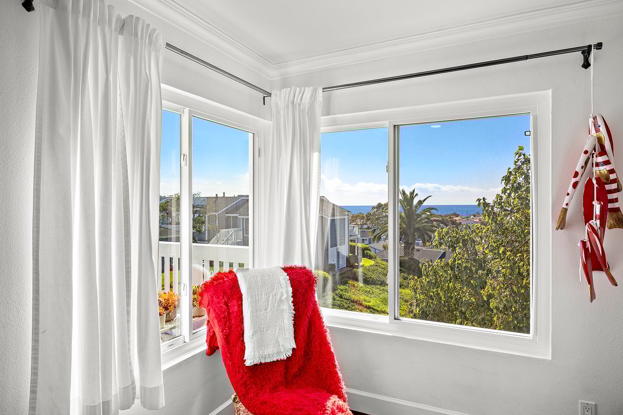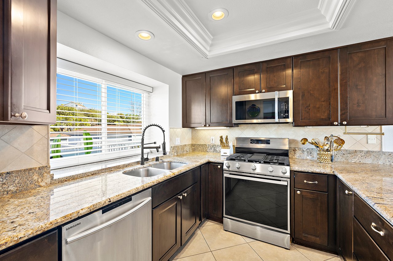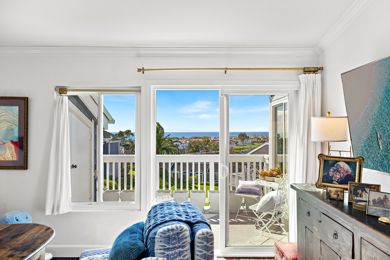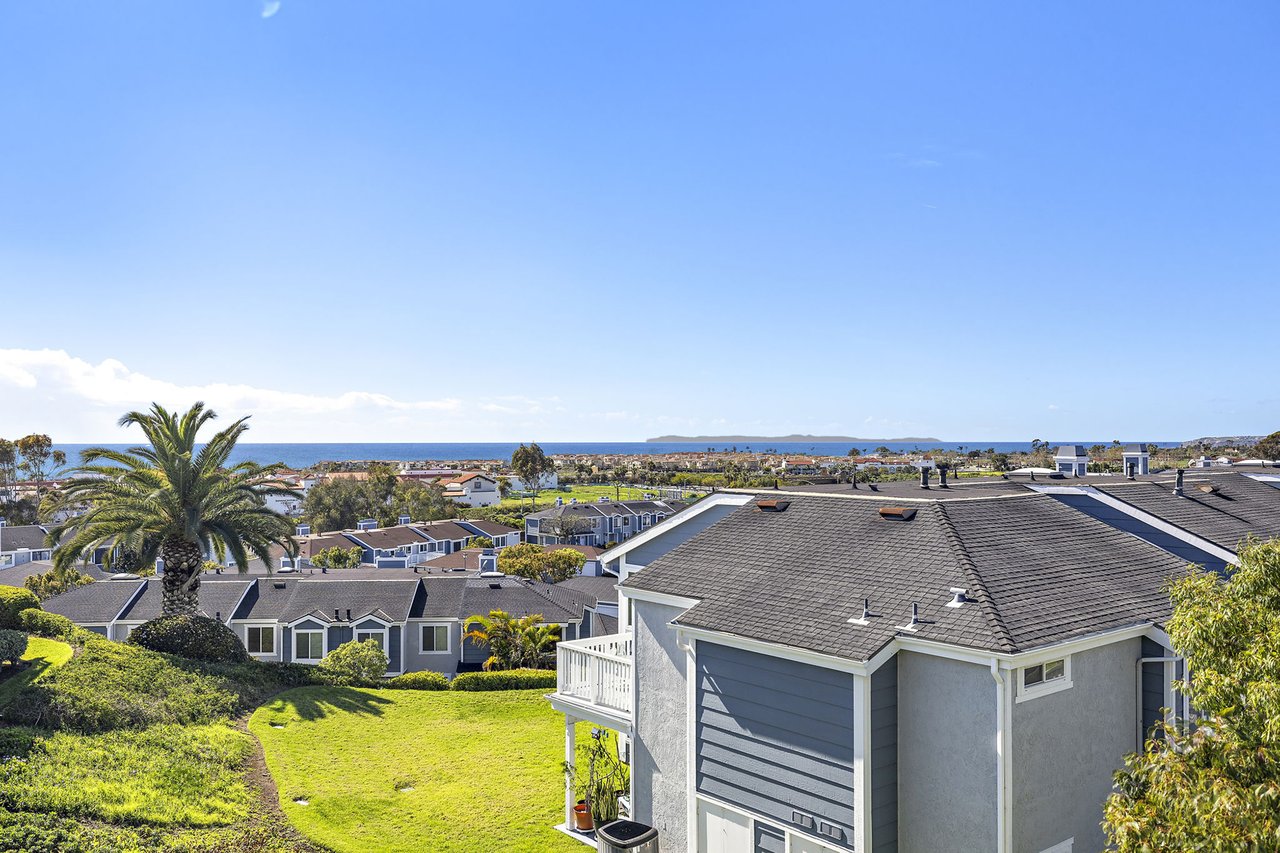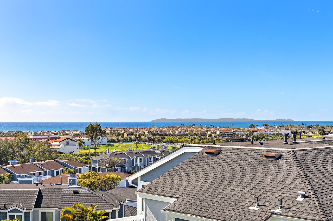 Set high in Faire Harbour within the Marblehead community, 2127 Avenida Espada is a top-floor, single-level residence with rare sit-down ocean views stretching to Catalina Island and settling into sweeping sunsets. From this elevated position, the Pacific becomes part of your everyday backdrop, shifting in color and mood from morning light to golden hour. Inside, vaulted ceilings and rich hardwood floors create a warm, airy atmosphere that feels refined yet relaxed. The living, dining, and kitchen spaces flow naturally together, oriented toward the patio and the coastline beyond. Ocean views are enjoyed throughout, from the main living areas to the kitchen and into the primary bedroom, creating a true horizon experience rather than a distant glimpse. The kitchen features clean-lined cabinetry, stone countertops, a coordinating backsplash, stainless steel appliances, recessed lighting, under-cabinet illumination, and a breakfast bar that keeps the space open and inviting. Gas cooking and air conditioning add everyday comfort, while dual-pane Anlin windows, crown moulding, and thoughtful detailing bring a finished, cohesive feel. Both bathrooms are well-appointed with a consistent, elevated aesthetic that complements the home's contemporary coastal style. The tiled patio extends the living space outdoors, offering an easy place to begin the day with ocean air or settle in as the sun drops into the Pacific. A private two-car garage, a rare offering within Faire Harbour, adds a level of convenience and storage not often found in this community. Faire Harbour's location in Marblehead offers a peaceful, elevated setting close to beaches, coastal trails, Avenida Del Mar, local dining, and the Outlets at San Clemente, with convenient access to the 5 freeway and Pacific Coast Highway. This is a home that blends view, comfort, and location into one cohesive experience, elevated above the coastline and grounded in the rhythm of a vibrant beach town.