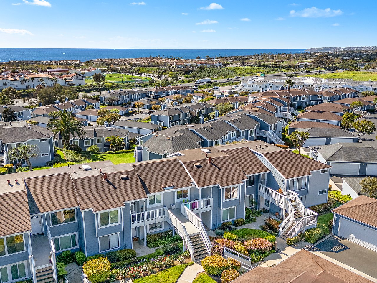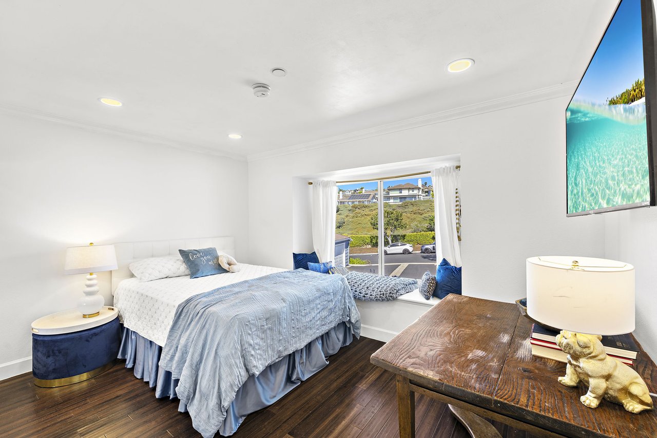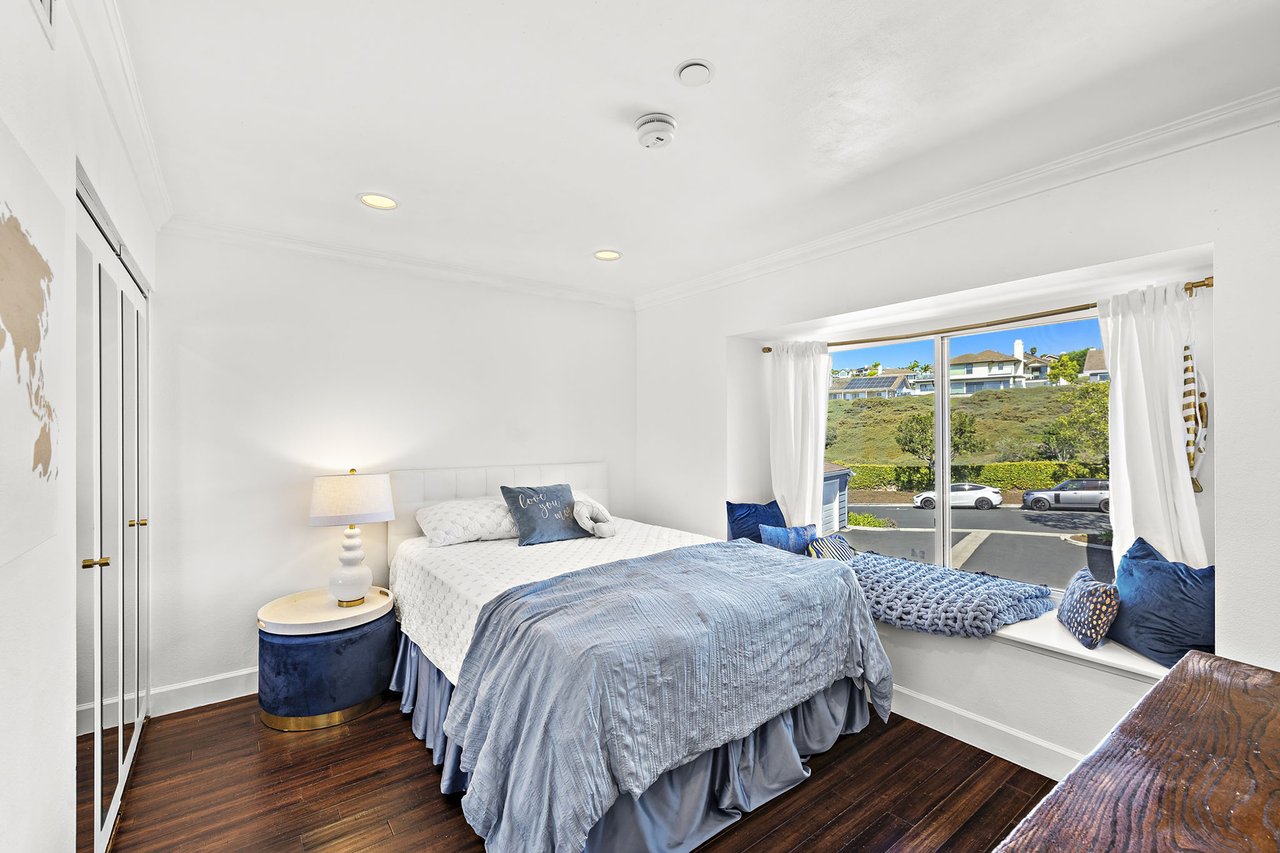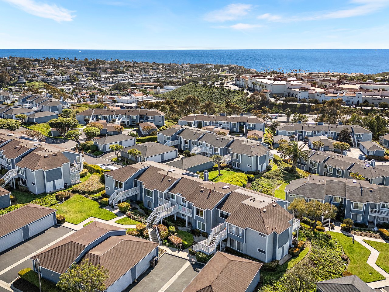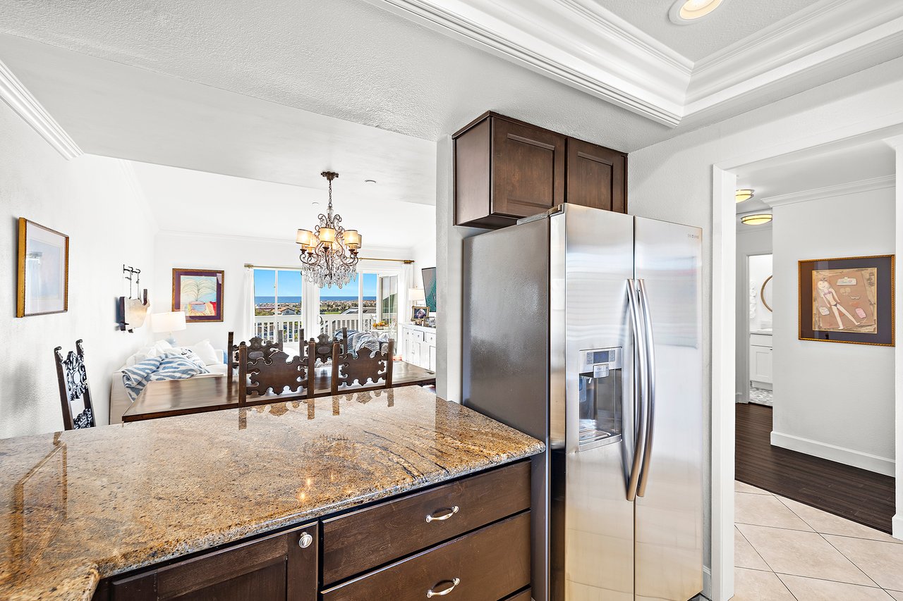 Set high in Faire Harbour within the Marblehead community, 2127 Avenida Espada is a top-floor, single-level residence with rare sit-down ocean views stretching to Catalina Island and settling into sweeping sunsets. From this elevated position, the Pacific becomes part of your everyday backdrop, shifting in color and mood from morning light to golden hour. Inside, vaulted ceilings and rich hardwood floors create a warm, airy atmosphere that feels refined yet relaxed. The living, dining, and kitchen spaces flow naturally together, oriented toward the patio and the coastline beyond. Ocean views are enjoyed throughout, from the main living areas to the kitchen and into the primary bedroom, creating a true horizon experience rather than a distant glimpse. The kitchen features clean-lined cabinetry, stone countertops, a coordinating backsplash, stainless steel appliances, recessed lighting, under-cabinet illumination, and a breakfast bar that keeps the space open and inviting. Gas cooking and air conditioning add everyday comfort, while dual-pane Anlin windows, crown moulding, and thoughtful detailing bring a finished, cohesive feel. Both bathrooms are well-appointed with a consistent, elevated aesthetic that complements the home's contemporary coastal style. The tiled patio extends the living space outdoors, offering an easy place to begin the day with ocean air or settle in as the sun drops into the Pacific. A private two-car garage, a rare offering within Faire Harbour, adds a level of convenience and storage not often found in this community. Faire Harbour's location in Marblehead offers a peaceful, elevated setting close to beaches, coastal trails, Avenida Del Mar, local dining, and the Outlets at San Clemente, with convenient access to the 5 freeway and Pacific Coast Highway. This is a home that blends view, comfort, and location into one cohesive experience, elevated above the coastline and grounded in the rhythm of a vibrant beach town.