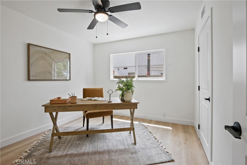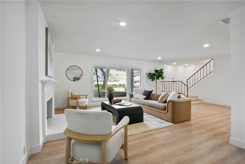 A crisp white exterior beneath a graceful shade tree sets the stage. Inside, natural light and open sightlines create an airy, inviting atmosphere. The designer kitchen anchors the home with waterfall-edge quartz counters, Shaker cabinetry, and stainless-steel appliances. A built-in wine fridge and dual sliders to the backyard make it equally suited for everyday living or entertaining.