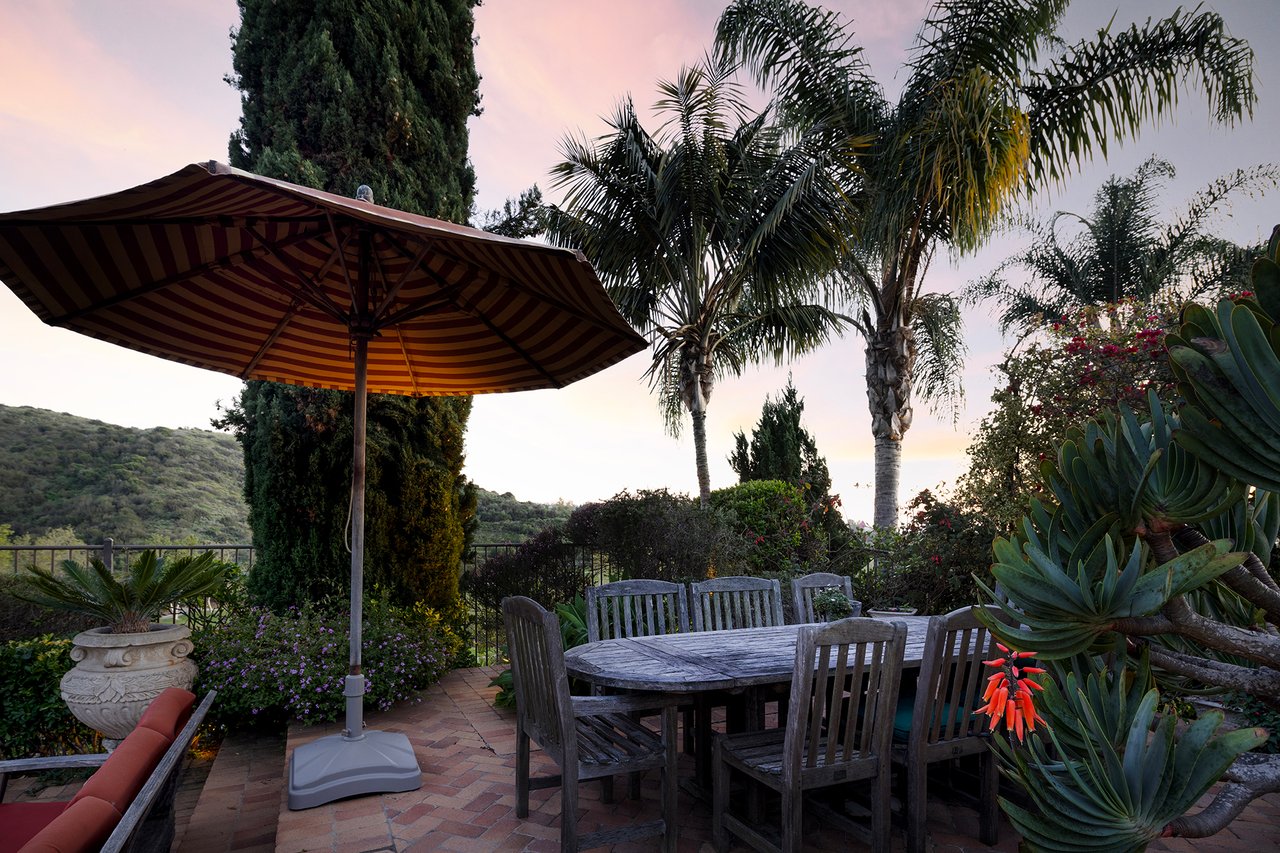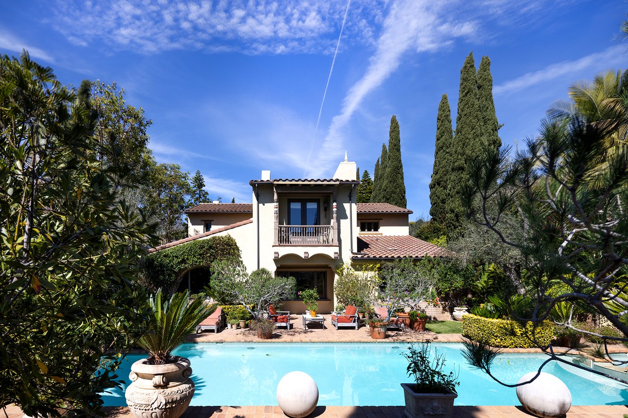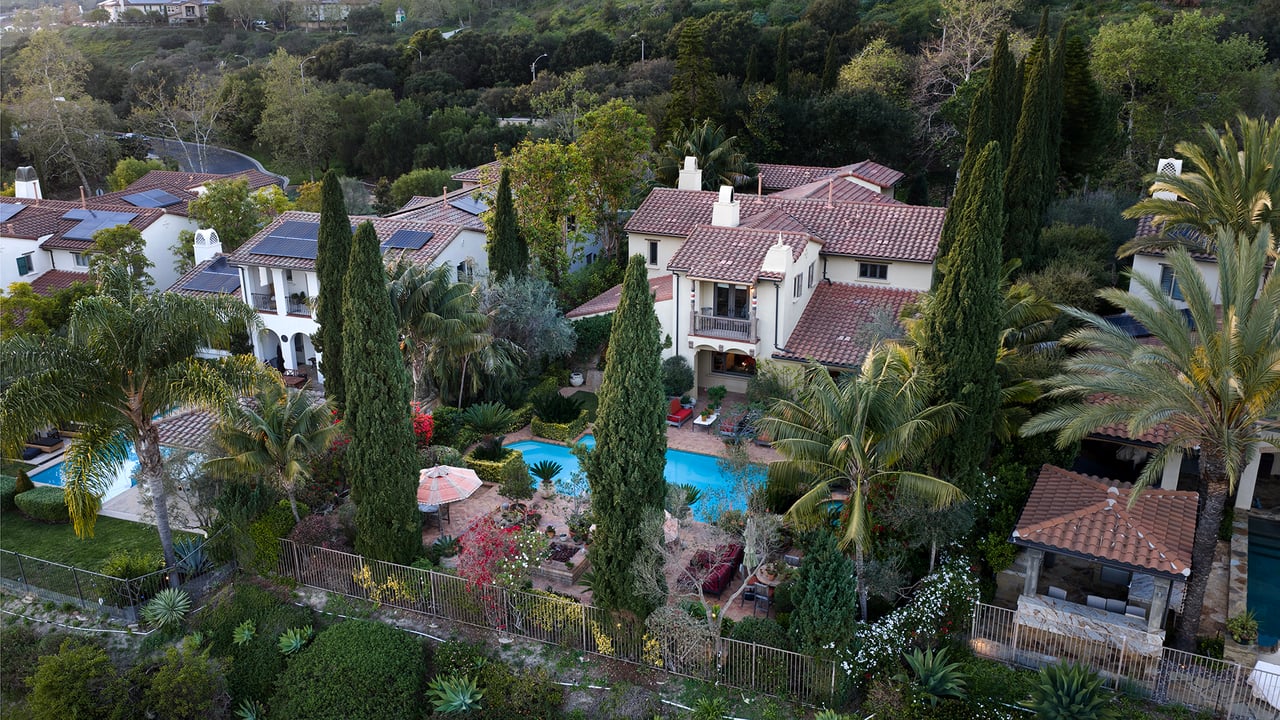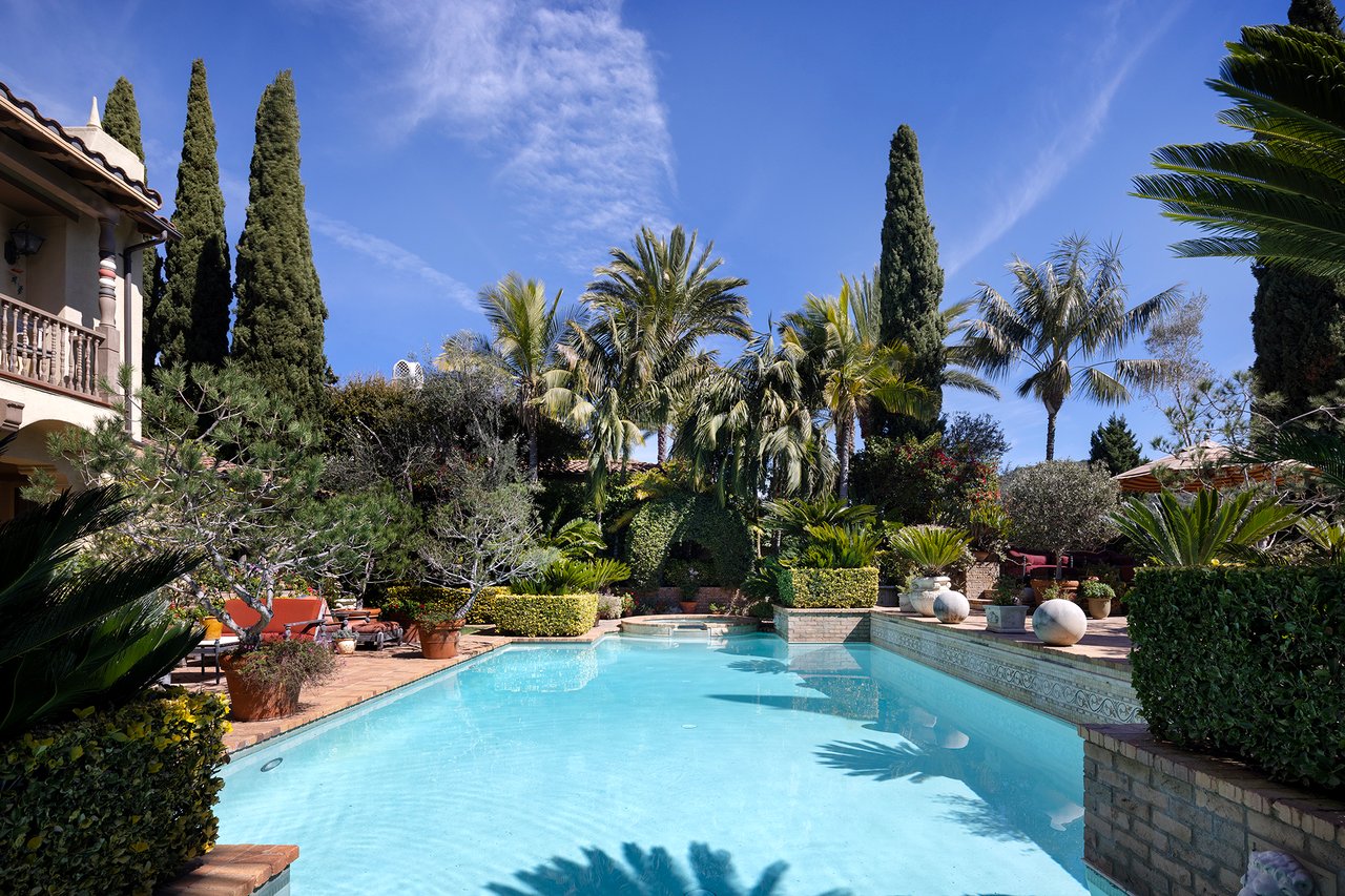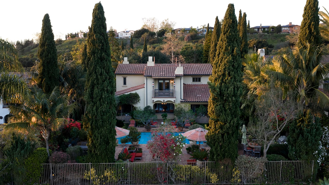 Set behind the gates of Careyes on one of its largest and most coveted 1/3-acre lots, this Italian Riviera-inspired estate unfolds like a private European retreat tucked quietly into the hills of San Clemente. From the moment you arrive, there is a shift. The architecture feels storied and intentional, rooted in another era. Soaring wood-beamed ceilings rise above Richard Marshall hardwood floors with intricate mosaic inlays, while wrought iron detailing, arched passages, and precast stone fireplaces create depth and romance throughout. The expansive floor plan offers six bedrooms, five full baths and two half baths, including two detached casitas. The downstairs casita is appointed with a high-end TV surround sound system, ideal for theater-style entertaining, while the upper casita offers its own private living space for guests or multigenerational flexibility. Formal and informal spaces flow into a gourmet kitchen with professional-grade appliances and granite countertops, allowing the home to live as beautifully as it entertains. Interior rooms and garden areas were pre-wired for high-end sound, creating a seamless indoor-outdoor experience. Upstairs, the primary suite serves as a private sanctuary, opening to a double-doored balcony with peek-a-boo ocean views beyond the rolling fairways of the Fred Couples-designed championship golf course and adjacent natural preserve. Yet it is the grounds that truly set this property apart. The backyard unfolds in terraces of aged brick, a rare architectural landscape that evokes the romance of the Italian coast. Imported Italian planters frame the estate, while mature landscaping forms a living wall of privacy, enclosing the property in quiet seclusion. Strategically placed water features provide a constant, soothing soundtrack as birds move through the trees throughout the day. At the heart of the garden, a resort-caliber pool shimmers with imported Walker Zanger Italian tile, paired with a heated spa that spills gently into the pool in a continuous cascade. Sunlight moves across brick and water as the day unfolds, creating an atmosphere that is immersive, transportive, and remarkably serene. Every pathway, hedge, and terrace has been considered with intention. The outdoor experience is not an accessory to the home. It is its soul.