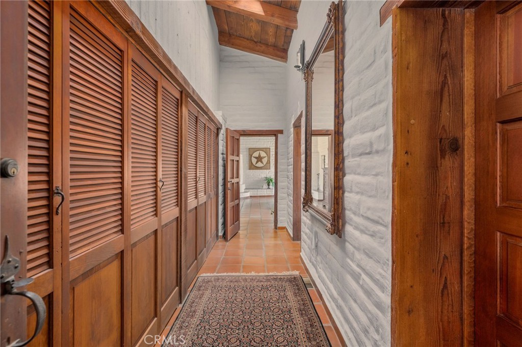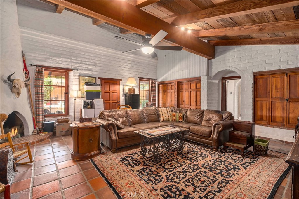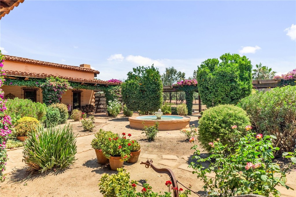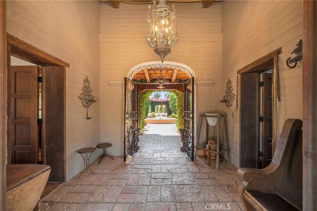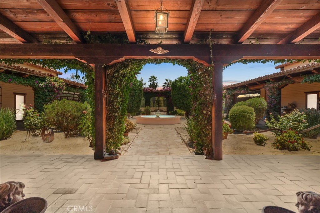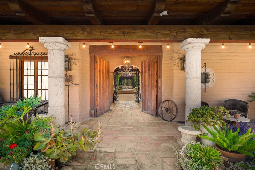 Arriving at the gates, you step through a porton--designed after the San Gabriel Mission--into a shaded vestibule, where the first view through the "Chancel Gate" is not of walls, but of open air: the courtyard and covered patio at the heart of the home. Fruit trees and flowers frame the fountain, their fragrance drifting through the breezeways that connect every room.