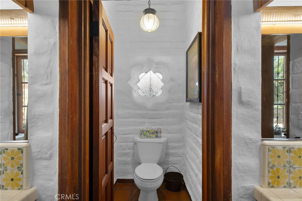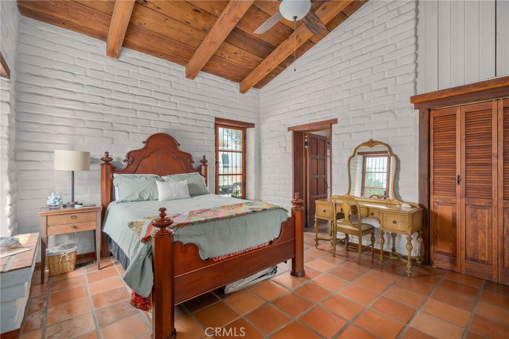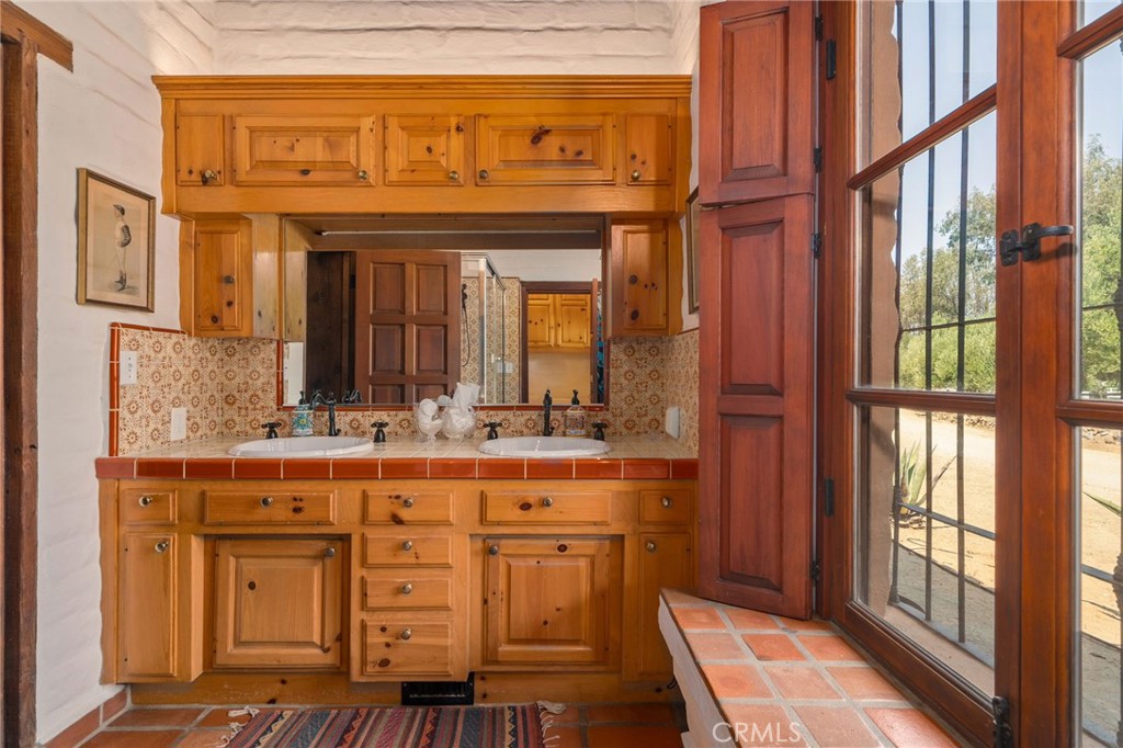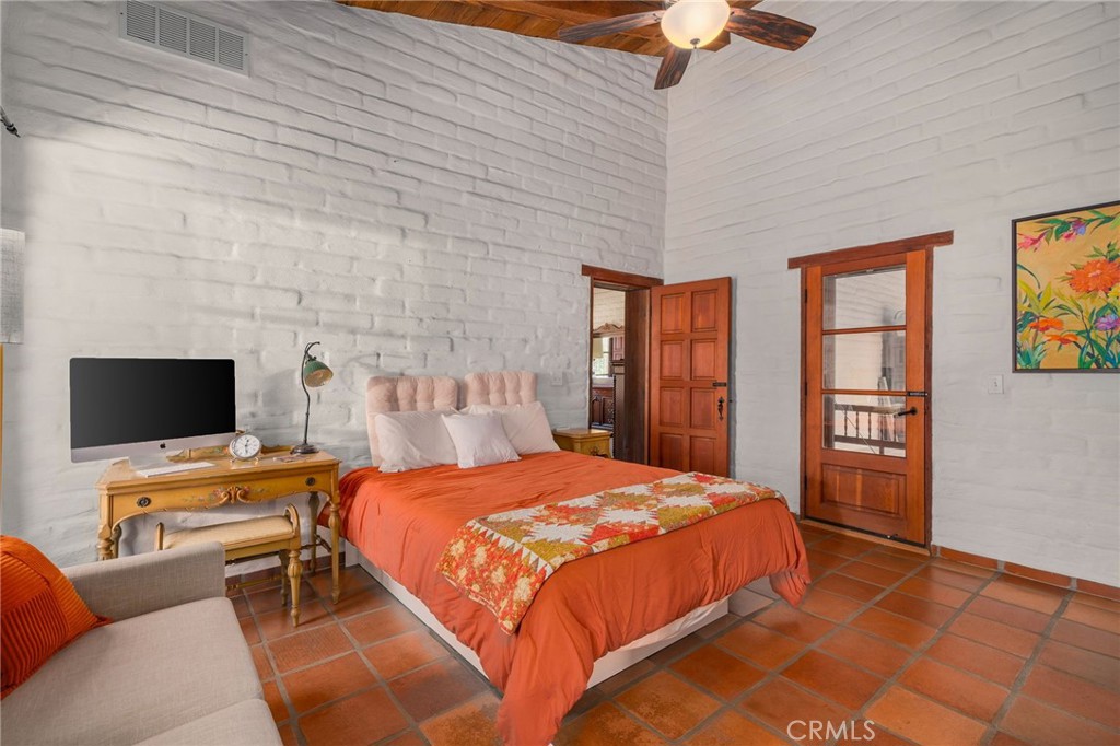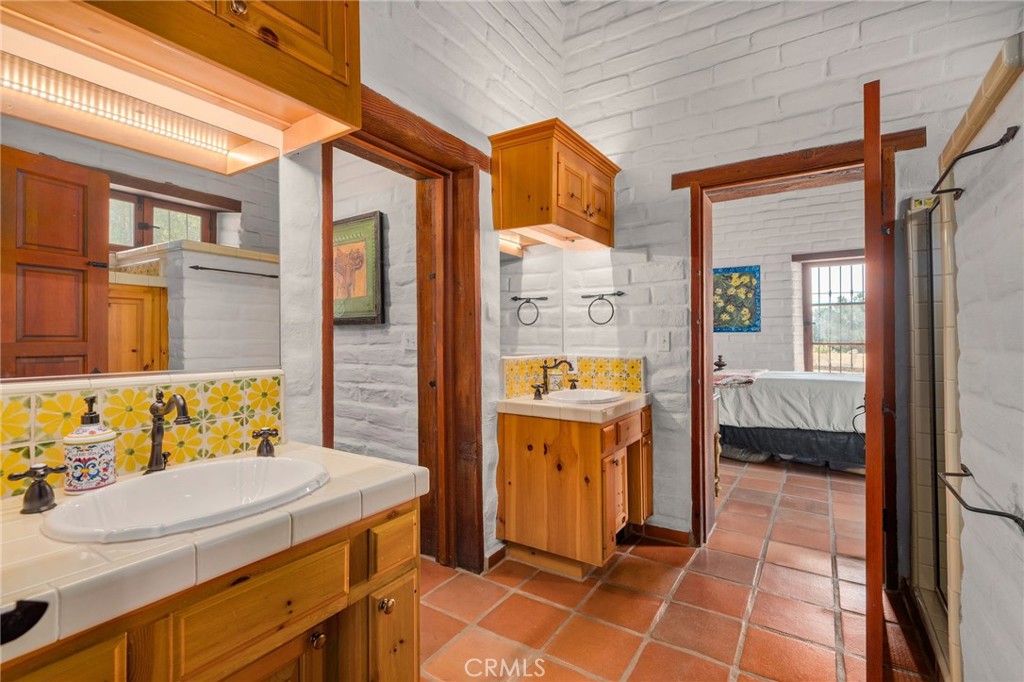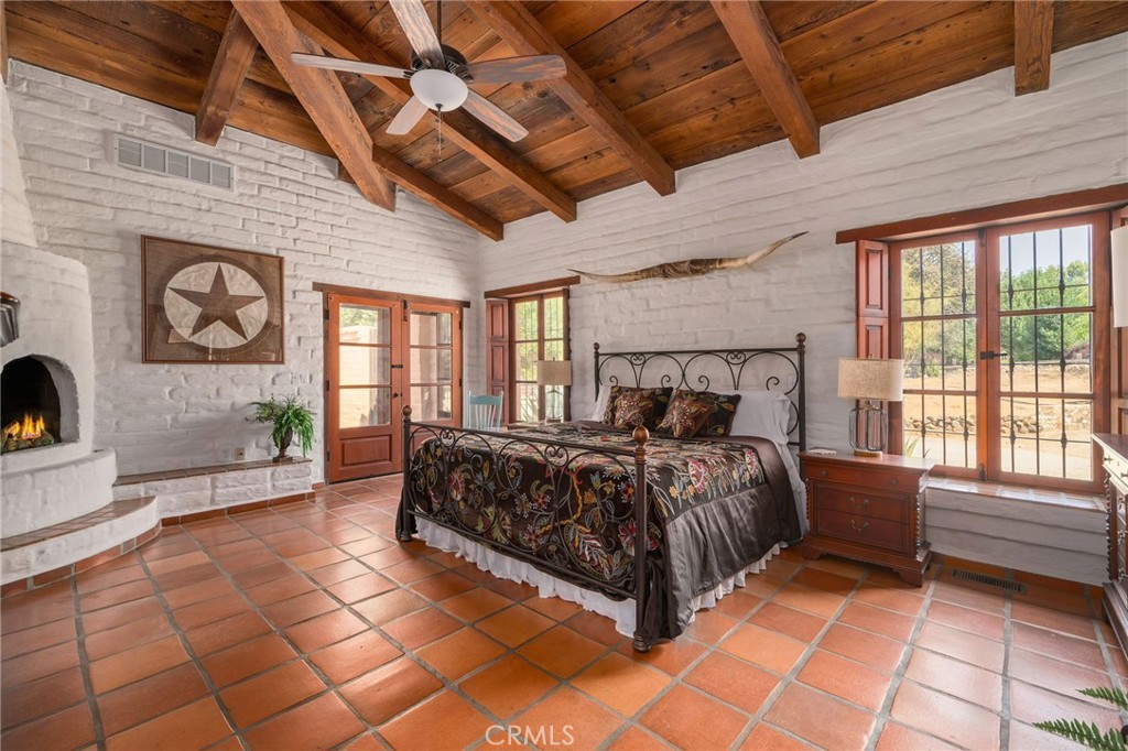 The primary suite opens to its own private patio and features a cozy sitting area with a New Mexico-style corner fireplace, complete with a raised hearth and rustic mantle. Its adjoining bath, with hand-tiled counters and shower, enhances the hacienda character. Two additional spacious bedrooms share a colorful bath finished in cheerful yellow and green Mexican tiles. Each room, true to hacienda tradition, opens directly to the courtyard, ensuring the garden and views are always close at hand.