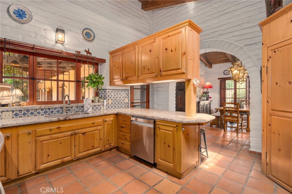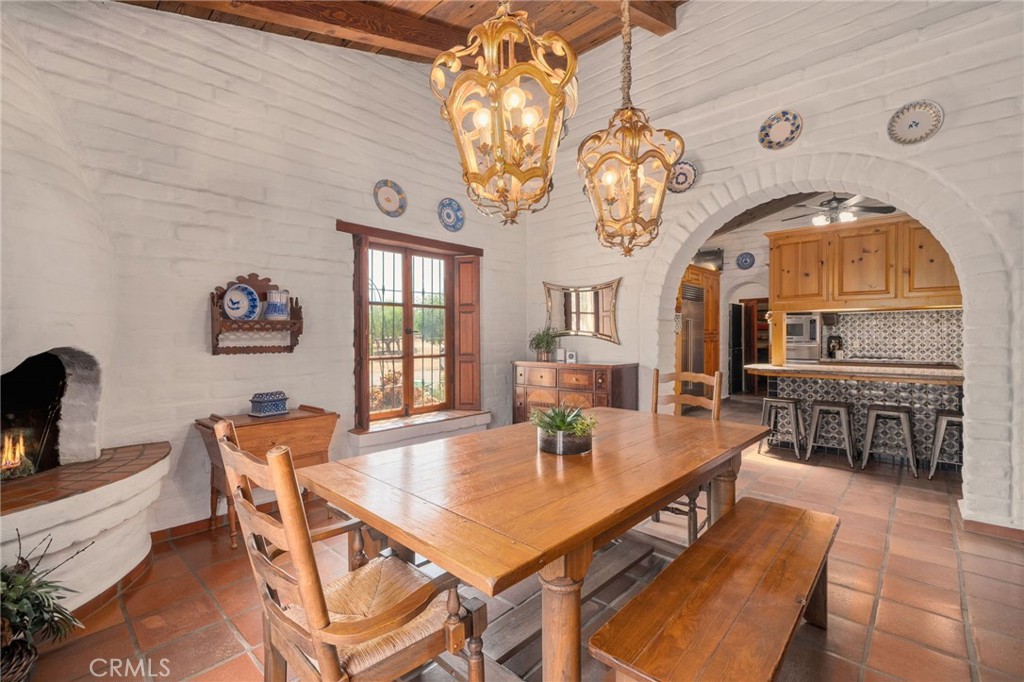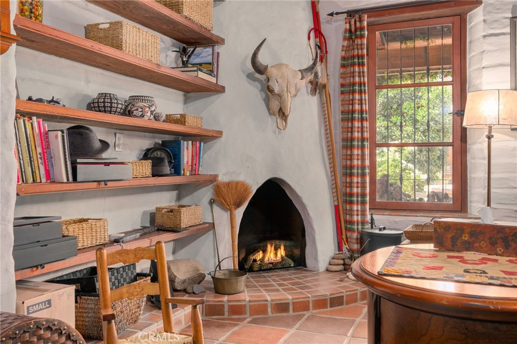 Inside, the hacienda reveals its character. The formal living room is anchored by a grand fireplace, its wood mantle reclaimed from an 18th-century Kentucky estate. Imported details--wrought iron window grilles, cantera stone columns, and handcrafted pavers--bring the spirit of Mexico into every corner. The kitchen is warm and inviting, with pine cabinetry, a blue tile backsplash, granite counters, and Sub-Zero refrigerator. Off one side, the family room beckons with a wall of bookshelves and a Hacienda-style floor-level fireplace, perfect for quiet evenings. On the opposite side, the dining room glows with the charm of a beehive fireplace, making every meal feel like a gathering.