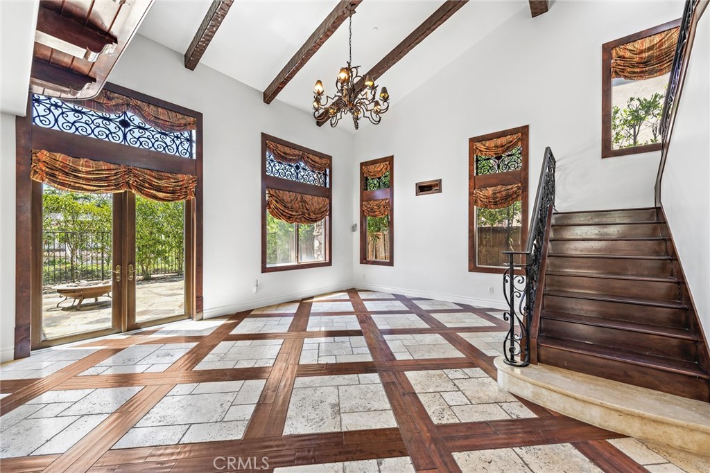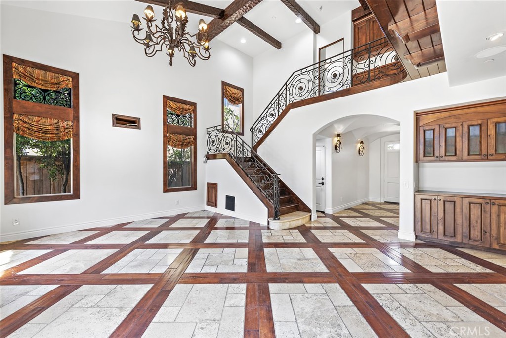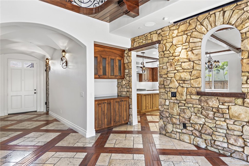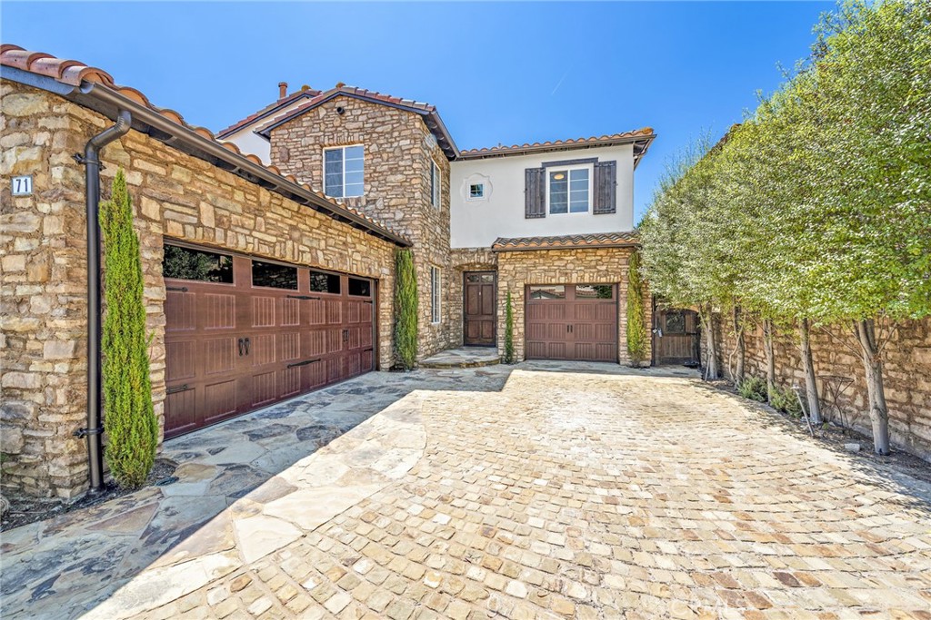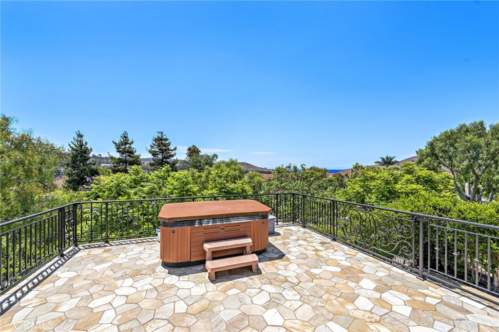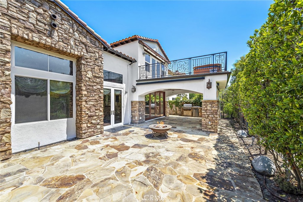 Rivaling custom homes with its impressive array of upgrades and refinements, this luxurious residence in Rancho San Clemente's gated Pacific Crest community is recently repiped and ready for move-in. Beautiful curb appeal is heightened with professionally maintained landscaping, water-saving synthetic turf, and a custom stone driveway. About 5,191 square feet, grounds continue in the private backyard, where stone decking complements a loggia with custom fireplace, in-ceiling heaters for year-round comfort, built-in speakers, a built-in BBQ bar with refrigerator, and remote-controlled shades creating a cozy outdoor room. Exceptional design and attention to detail is evident indoors as well, where virtually every room is adorned with custom enrichments. An arched cross-loin ceiling crowns the foyer, which leads to a stunning living and dining area with vaulted and beamed ceilings, a bar, custom stone wall, magnificent staircase with custom wrought iron railing, projector, and whole room black out curtains for entertaining. Matching wrought-iron detail graces nearby windows. Slideaway doors that open to the loggia provide an indoor/outdoor feel to the family room, where a beamed ceiling, fireplace and custom built-in entertainment center are on display. The family room offers a seamless transition to a chef's kitchen with island, a walk-in pantry, handsome wood cabinetry, custom countertops, and stainless-steel appliances including a new Viking six-burner range and matching vent hood. Four bedrooms, three baths and an office are offered in approximately 2,781 square feet of living space that is enhanced with fresh paint, custom wood and tile flooring, indoor/outdoor audio, wood interior doors, custom lighting fixtures, custom millwork, and a split three-car garage with built-in cabinetry and overhead storage. A library loft overlooks the living room, and the primary suite features a large and sunny deck with awning, hill views and a spa, a walk-in closet with built-ins, two sinks, a sit-down vanity, a soaking tub and a separate shower. Residents of Pacific Crest are rewarded with a prized location that is surrounded by rolling hills and open space. Outstanding schools, Vista Hermosa Sports Park, the Plaza Pacific shopping center, golf courses, hiking trails, and San Clemente's famous beaches and pier are enviably close.